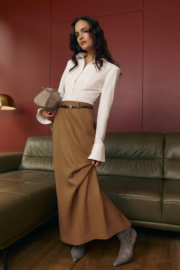 Офисный минимализм: жакеты, блузки с асимметрией, классические брюки или юбки меди.