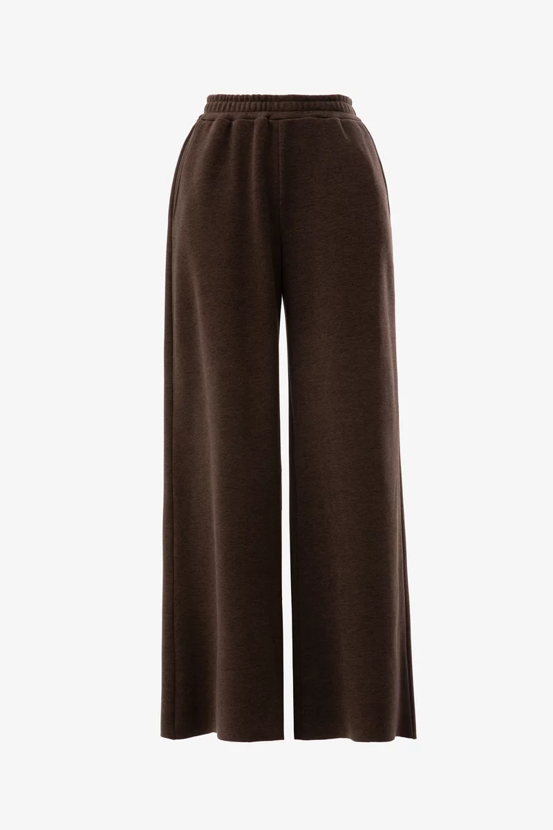Брюки прямого свободного кроя из приятного к телу трикотажа, отлично сохраняющего тепло. Модель с боковыми карманами. Пояс на резинке дополнительно подчеркивает талию и позволяет выбрать комфортную высоту посадки