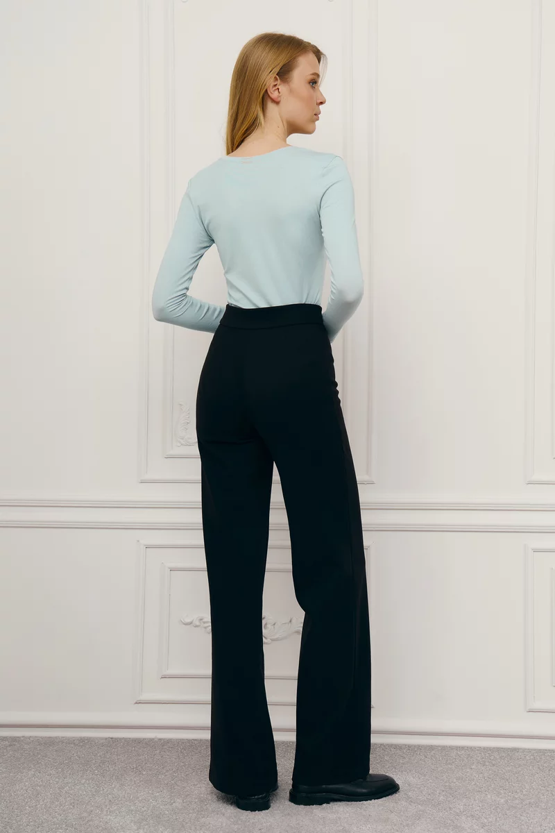 Брюки-палаццо свободного прямого кроя из мягкой, приятной к телу костюмной ткани. Модель с высокой посадкой и асимметричным поясом. Брюки застегиваются на пуговицы и скрытую молнию спереди