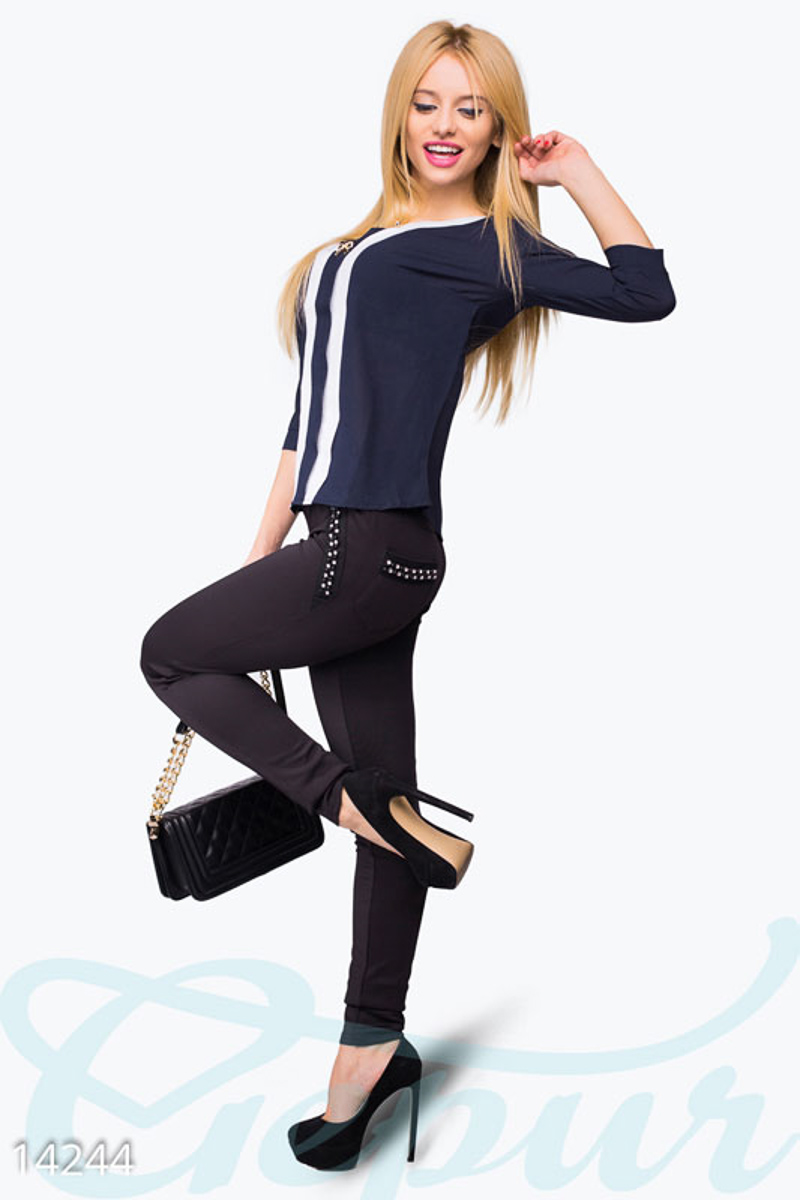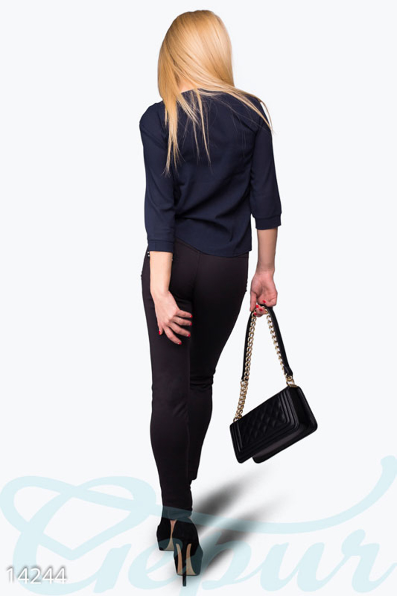 Блуза, декорированная металлической брошью в форме бантика. Застегивается на горловине на пуговичку, образуя небольшой разрез в зоне декольте. Идеально смотрится как под брюки, так и под юбку-карандаш.