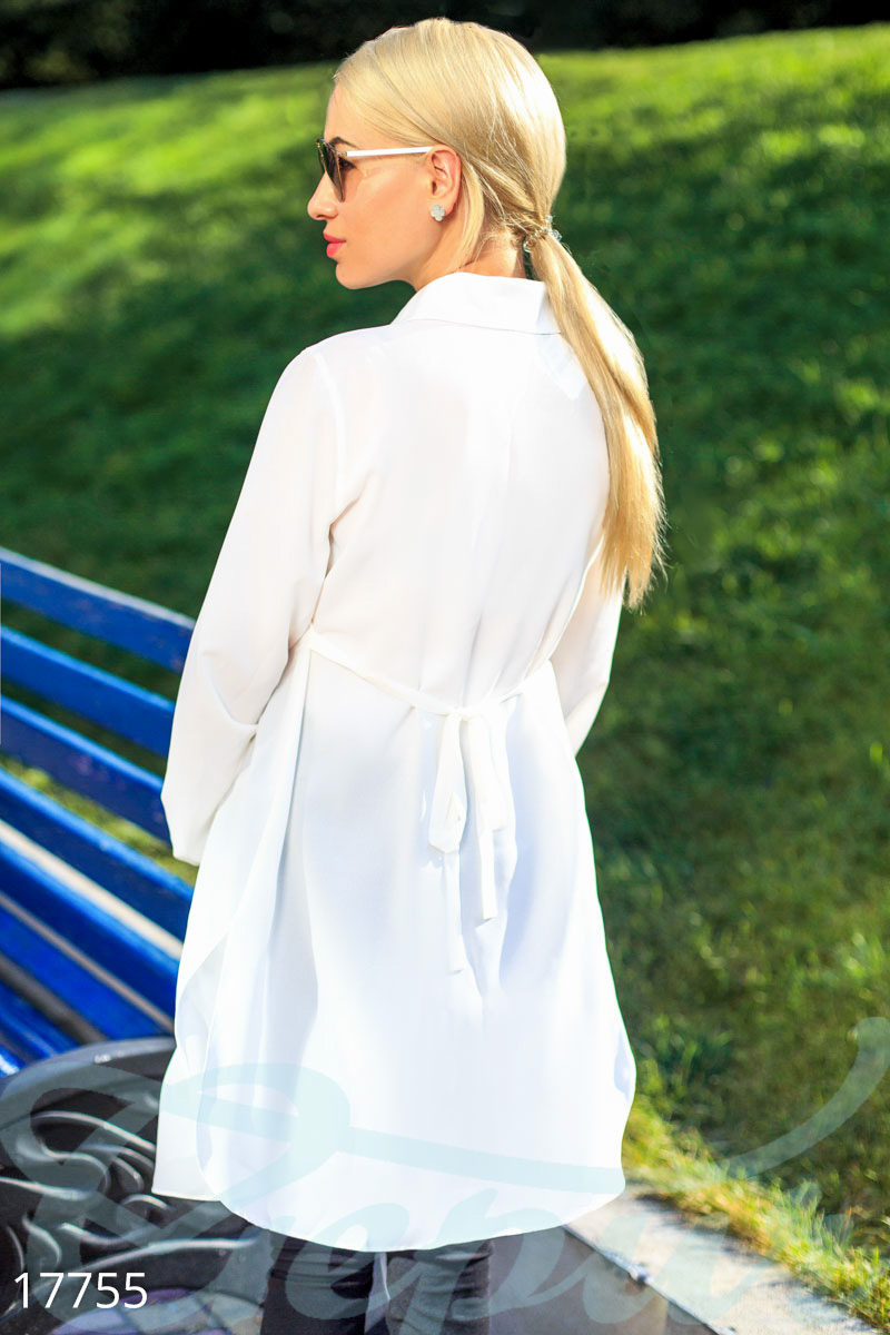 Удлиненная блуза на пуговицах для будущих мам, выполненная из воздушного шифона: классический отложной воротник, длинный рукав с застежкой на пуговицу, и тонкий пояс с завязками по бокам.