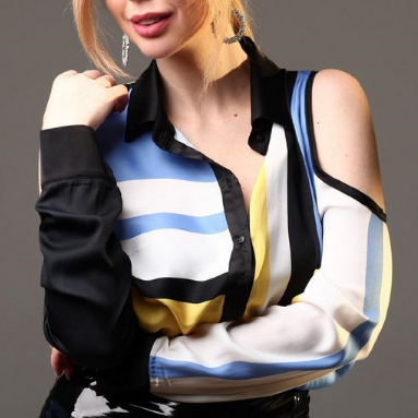 Шелковая блузка в стиле color block от дизайнеров Gepur: строгий отложной воротник, длинный рукав с манжетой на пуговицах и большими вырезами на плечах. Лицо коллекции: Сrystal Виктория - финалистка Мисс Украина 2015, популярный Instagram-блоггер и it-girl.
