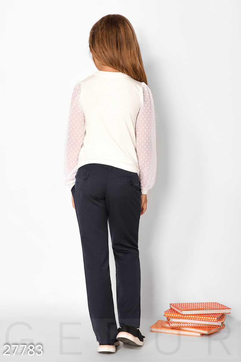 Брали для девочки в школу,цвет красивый-молочный.На рост 134 брали размер 140,получилось с небольшим запасиком. В составе есть хлопок,комфортна в носке