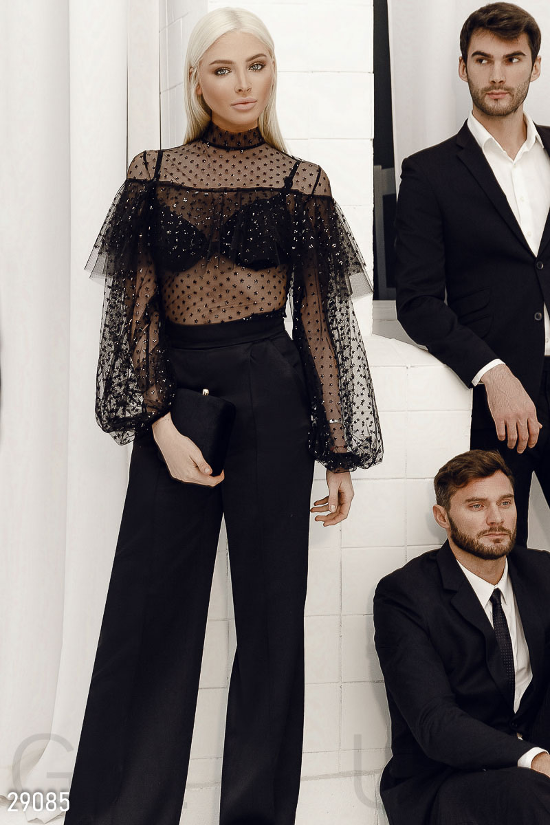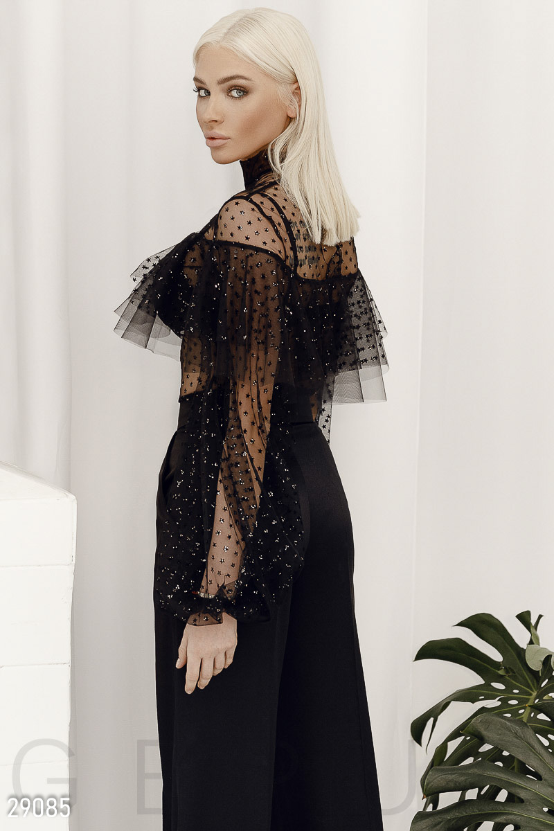Прозрачная блузка от дизайнеров Gepur, выполненная из воздушной сетки с флоковым напылением и блестками: аккуратный воротник-стойка, объемный волан на кокетке и эффектный пышный рукав с эластичной манжетой. Коллекцию представила Алена Шишкова – 2-я Вице-мисс Россия 2012.
