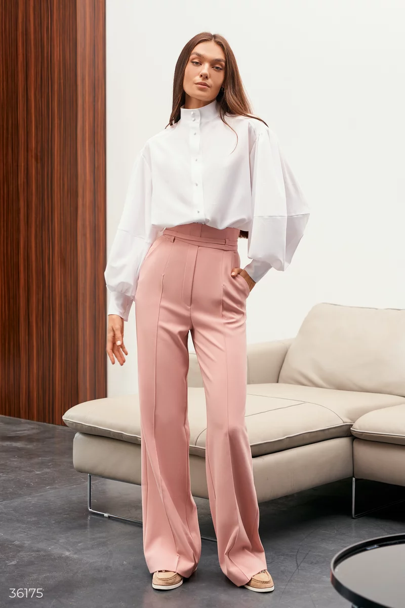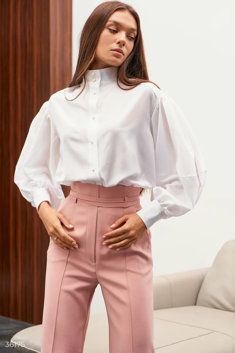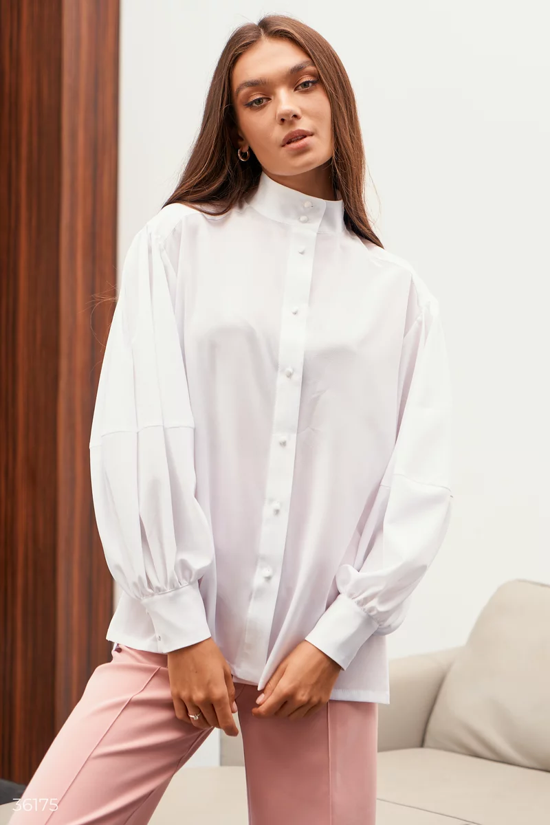 Блуза-рубашка выполнена из легкого шифона, позволяющего телу дышать. Модель дополняет одна из главных тенденций 2022 – объемные рукава на широких манжетах. На нижней кромке сделаны боковые разрезы, что делает фасон более свободным.