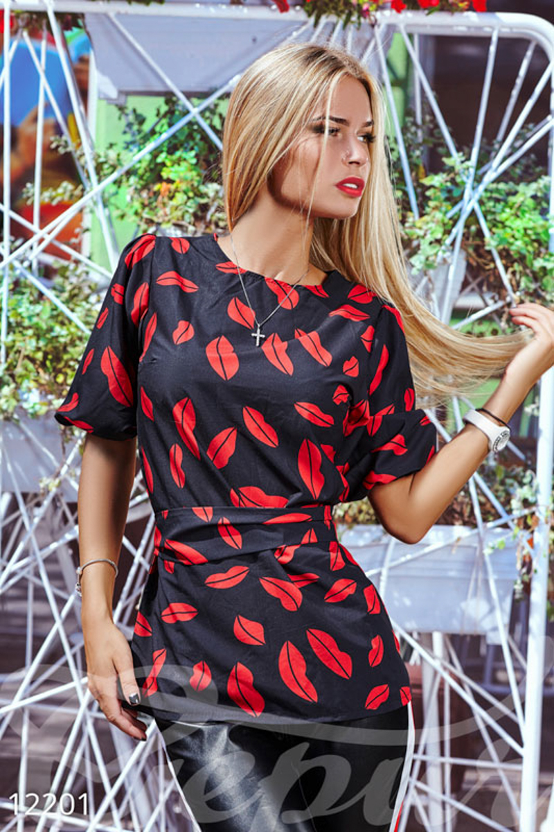 Стильная удлиненная блузка с принтом ярких губ по всей модели. Сама по себе блузка свободная, но перехватывается пояском, что позволяет ей визуально увеличить грудь и подчеркнуть талию. На груди есть вытачки. Рукава фонариком, посажены на узкую резинку. Отличный выбор на каждый день! Материал: тонкий полированный коттон Длина: 69 см Цвет: черный, красный