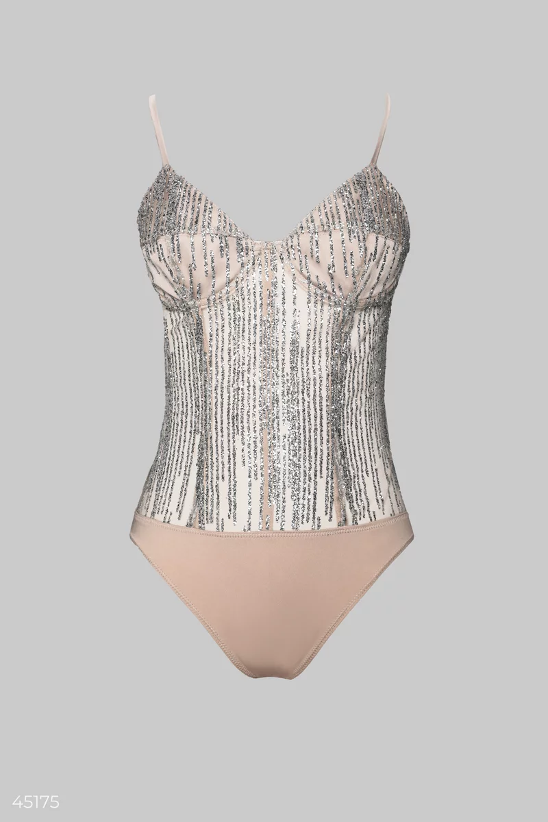 Эффектный боди с чашками из костюмной плотной ткани. Тонкие регулируемые бретели. Застёгивается на тайную змейку сзади. Имеет вставки из полупрозрачной сетки с блестками. Изделие украшено оригинальным напылением, создающим эффект мерцающего шлейфа Gepur: излишки напыления немного осыпаются, оставляя за собой легкий звездный след.