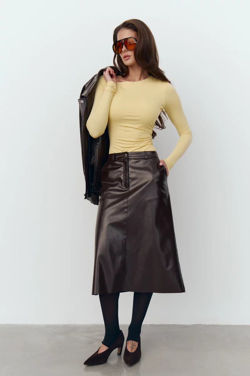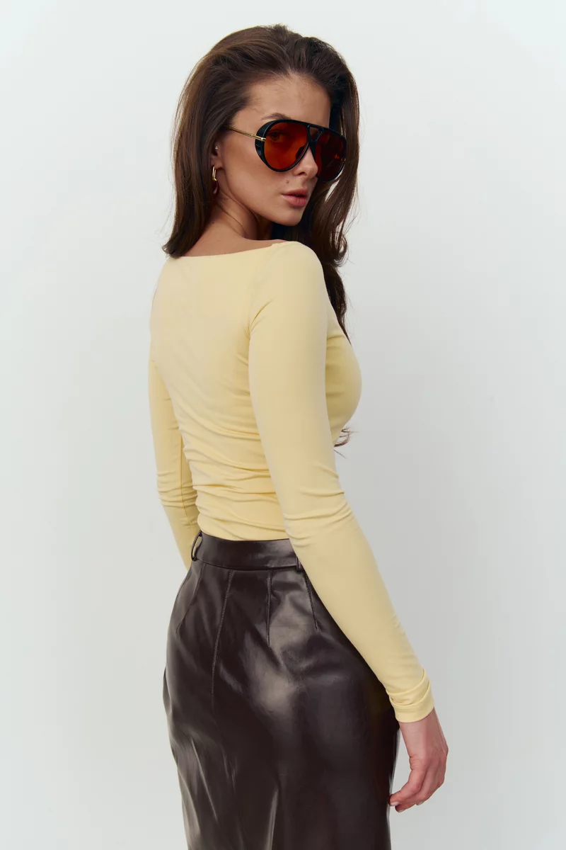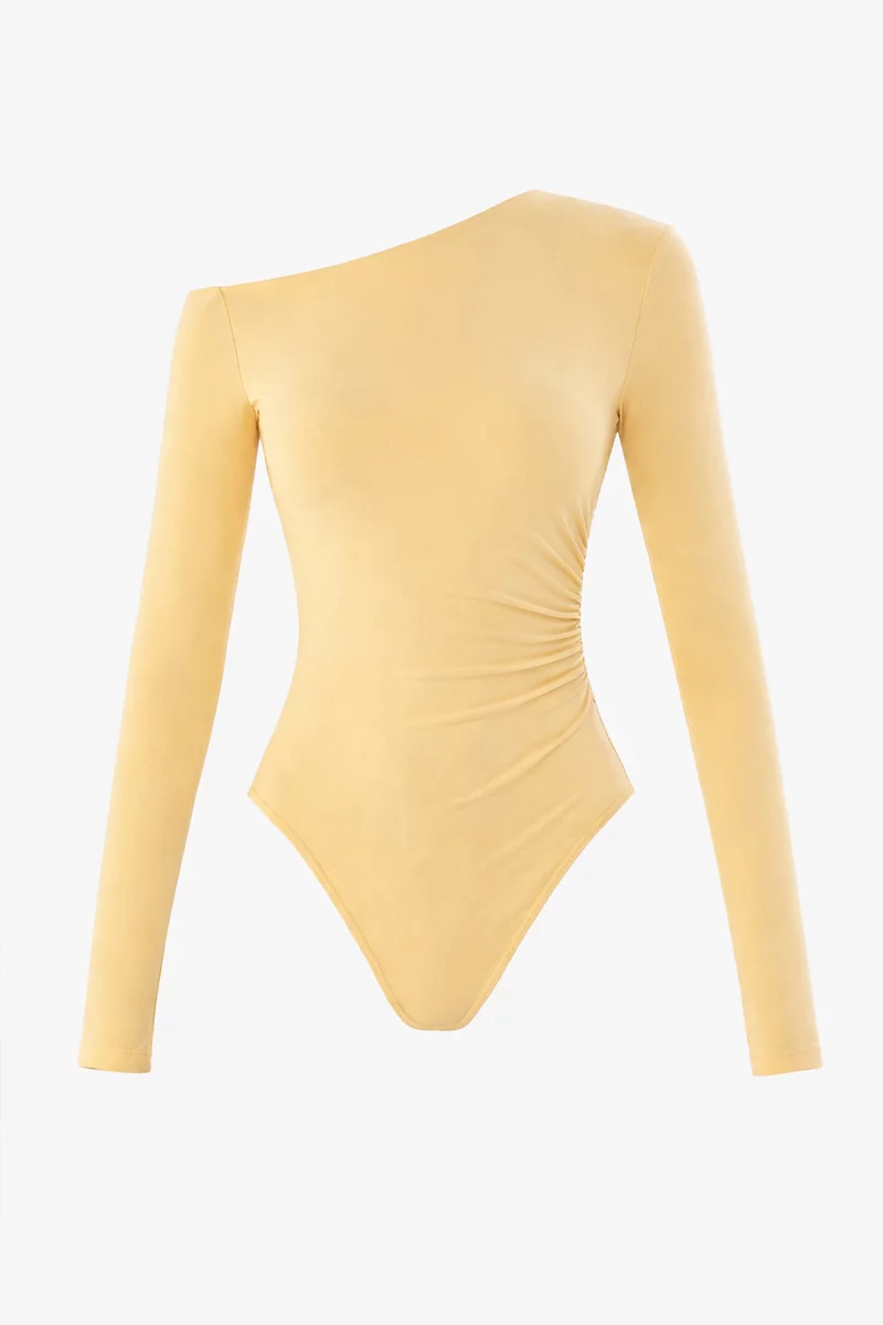 Облегающий боди с длинным рукавом из приятной к телу трикотажной ткани. Акцентная деталь – асимметричный вырез. Застёгивается на кнопки