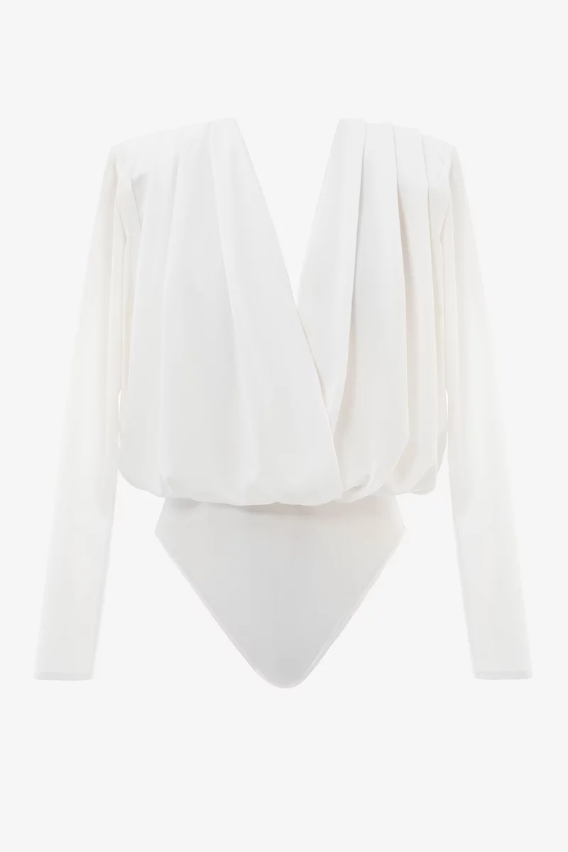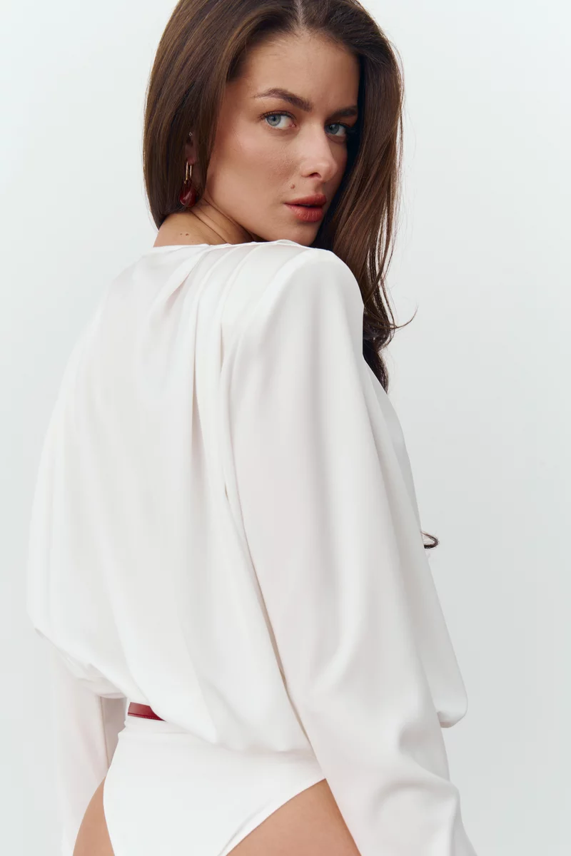 Сатиновая блуза с соблазнительным элементом – акцентным декольте. В плечах предусмотрены мягкие вставки для хранения линий. Застёгивается на кнопки