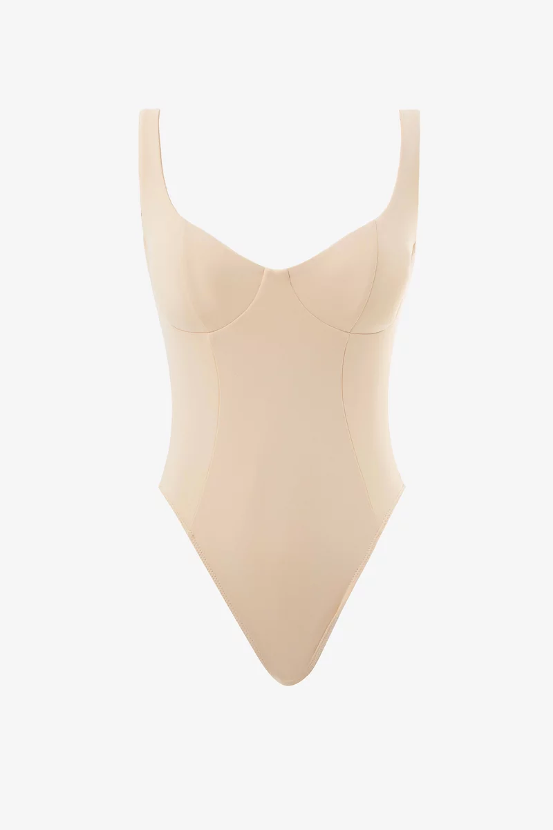 Облегающий боди на тонких бретелях из приятной к телу трикотажной ткани. Модель с акцентным лифом, имеет съемные поролоновые чашки. Застегивается на кнопки и дополнительно металлическую застежку на спинке. На подкладке