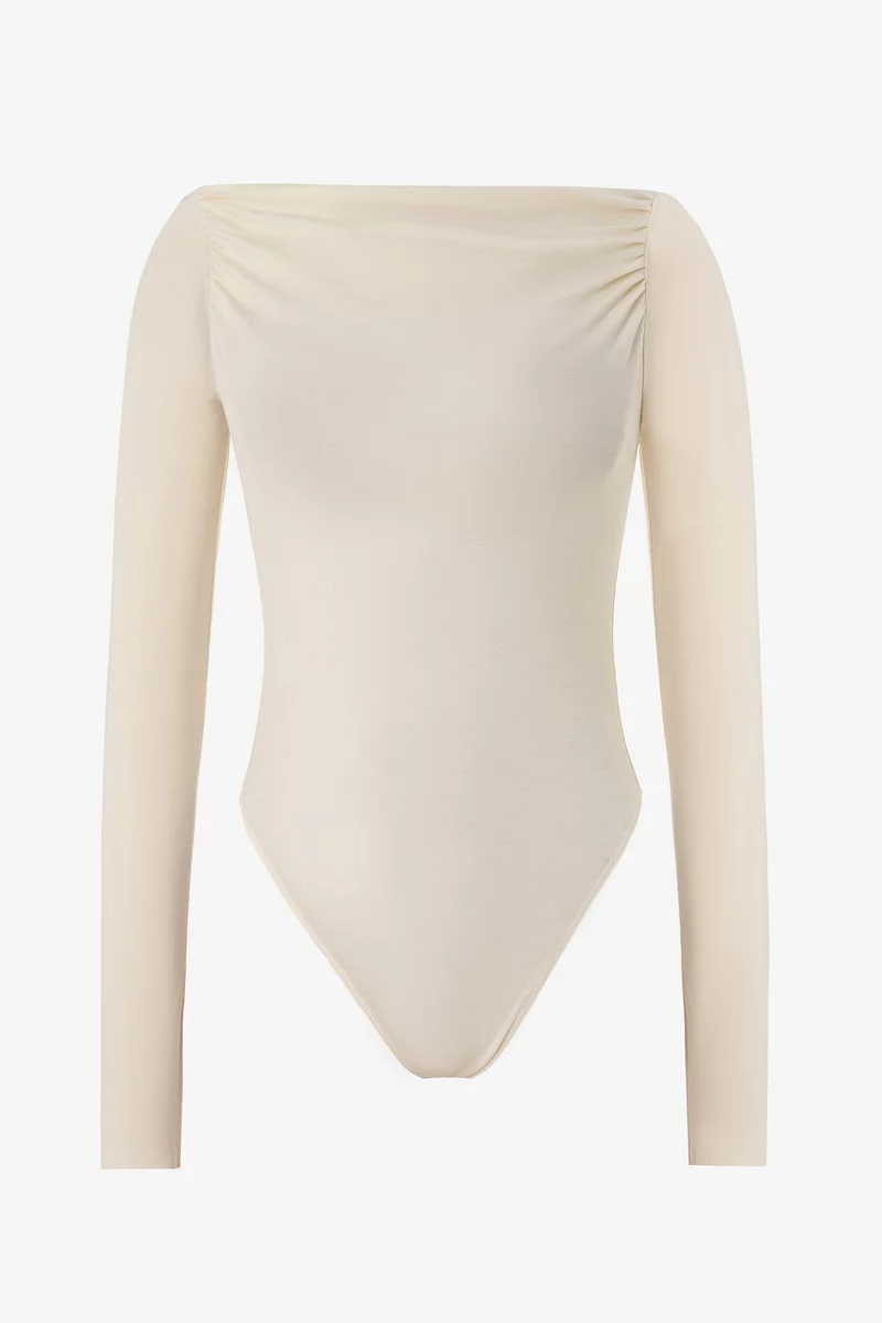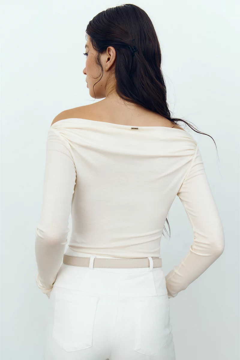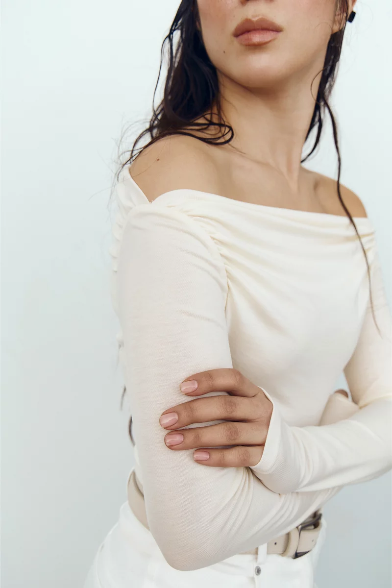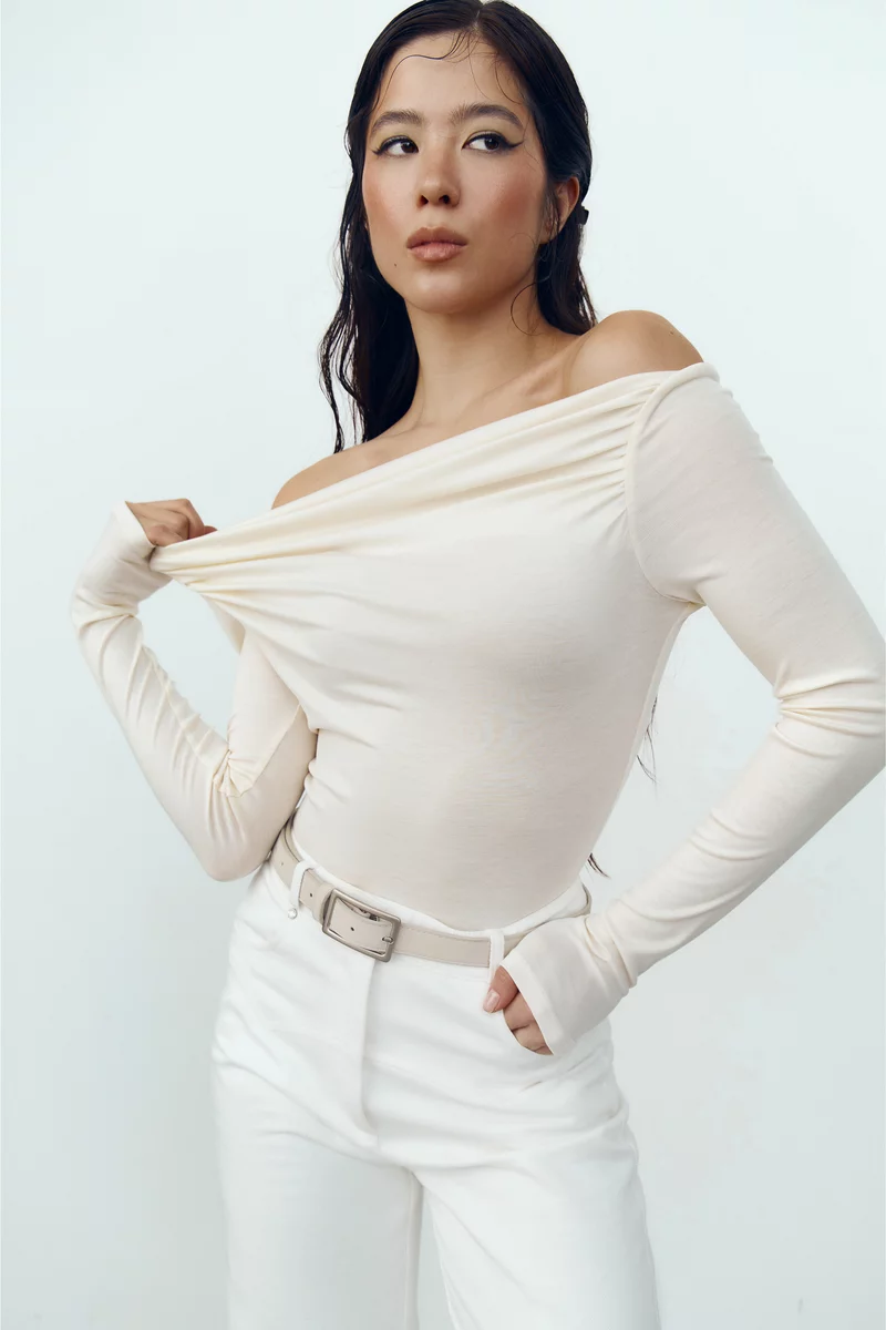 Молочный трикотажный боди с открытыми плечами