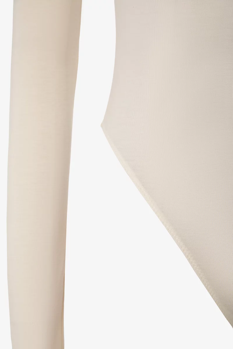 Облегающий боди с длинным рукавом из приятной к телу трикотажной ткани. Акцентная деталь – боковая драпировка. Боди можно носить как с открытыми плечами, так и регулируя желаемую высоту. Застёгивается на кнопки