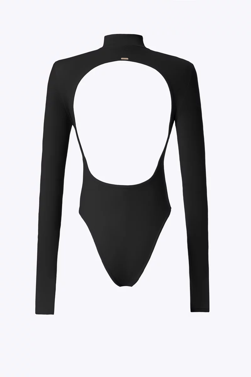 Облегающий боди с длинным рукавом. Акцентная деталь – открытая спина. Застёгивается на кнопки