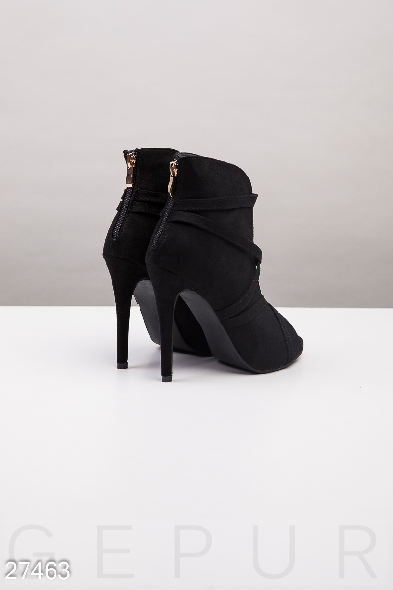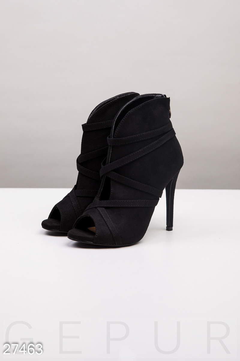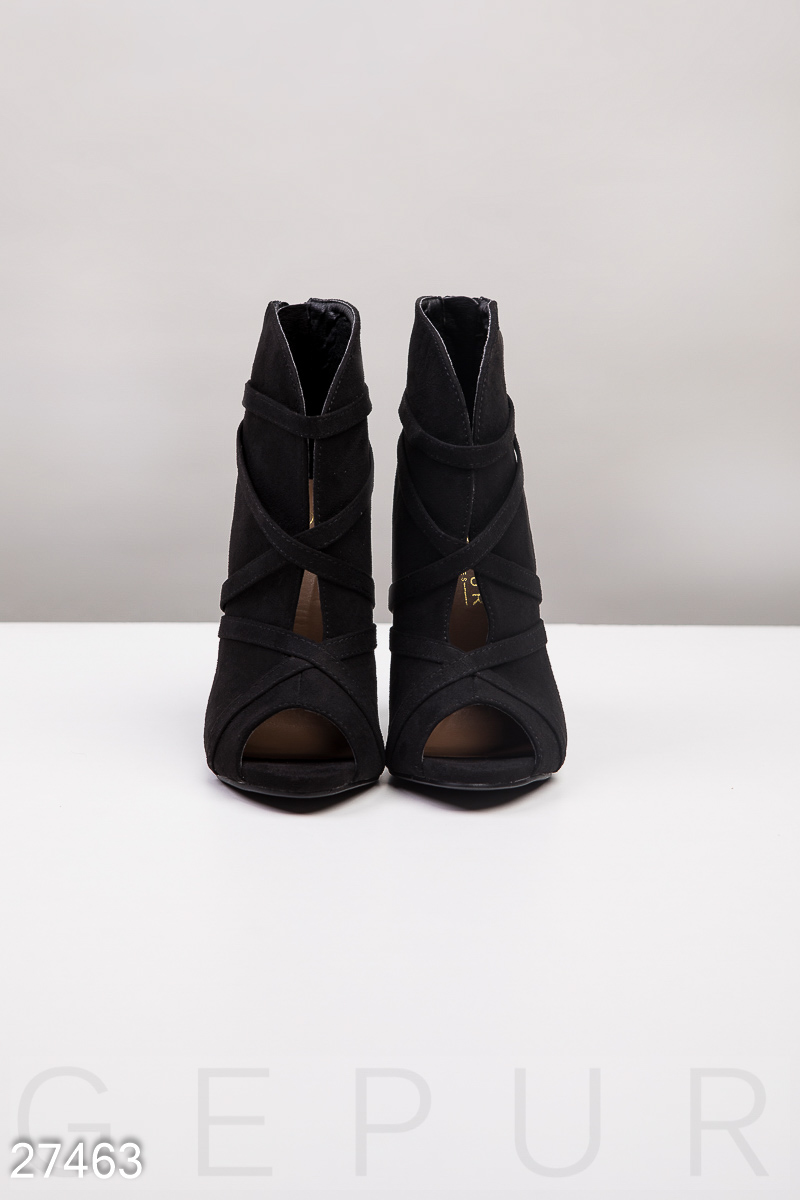 Стильные ботильоны из качественной эко-замши, с открытым носком, застежкой на молнию и фигурным вырезом спереди, украшенным узкими ремешками накрест.