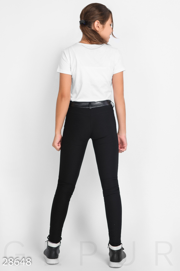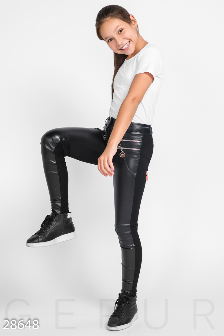 Стильные комбинированные леггинсы для девочки, украшенные вставками из эко-кожи спереди и декором металлическими молниями.