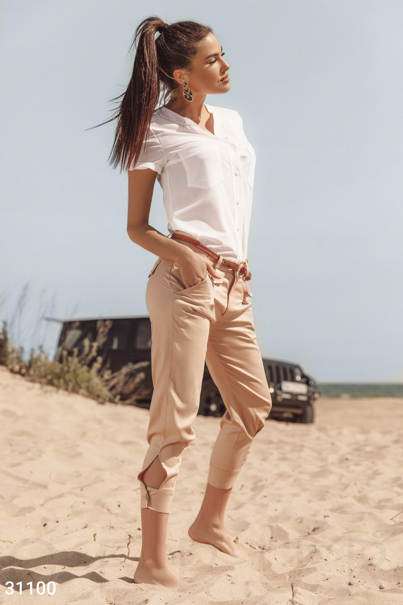 Классические брюки длиной 7/8 средней посадки, дополненные контрастным ремнем: аккуратные защипы, два прорезных кармана и два накладных с клапаном, небольшие разрезы по бокам.
