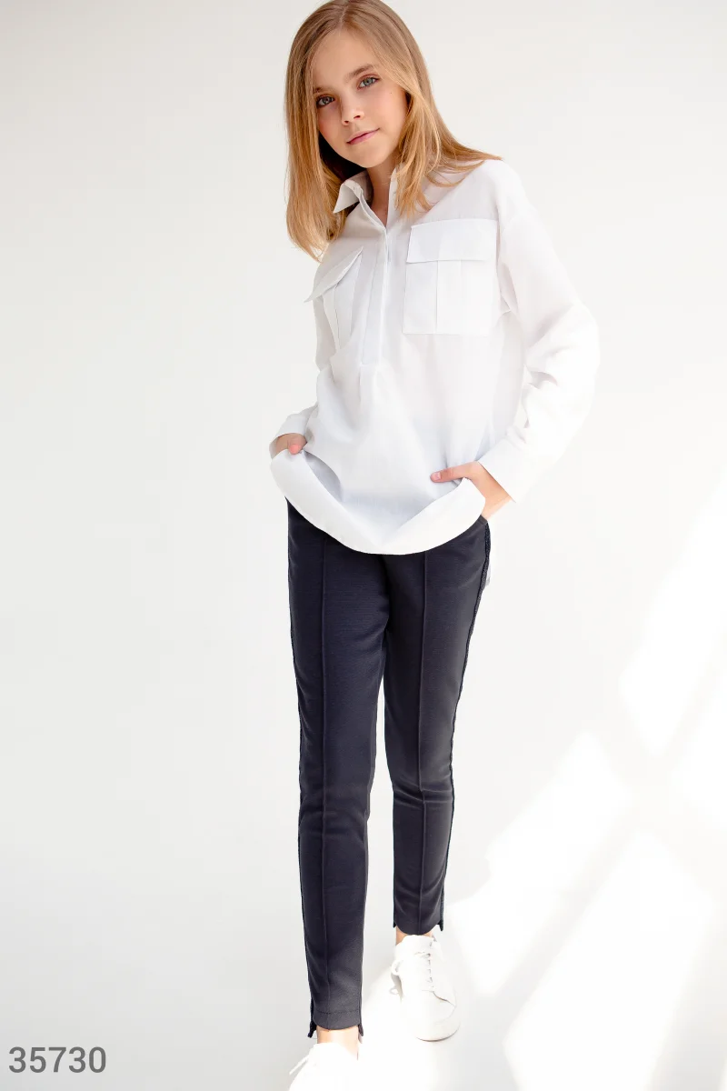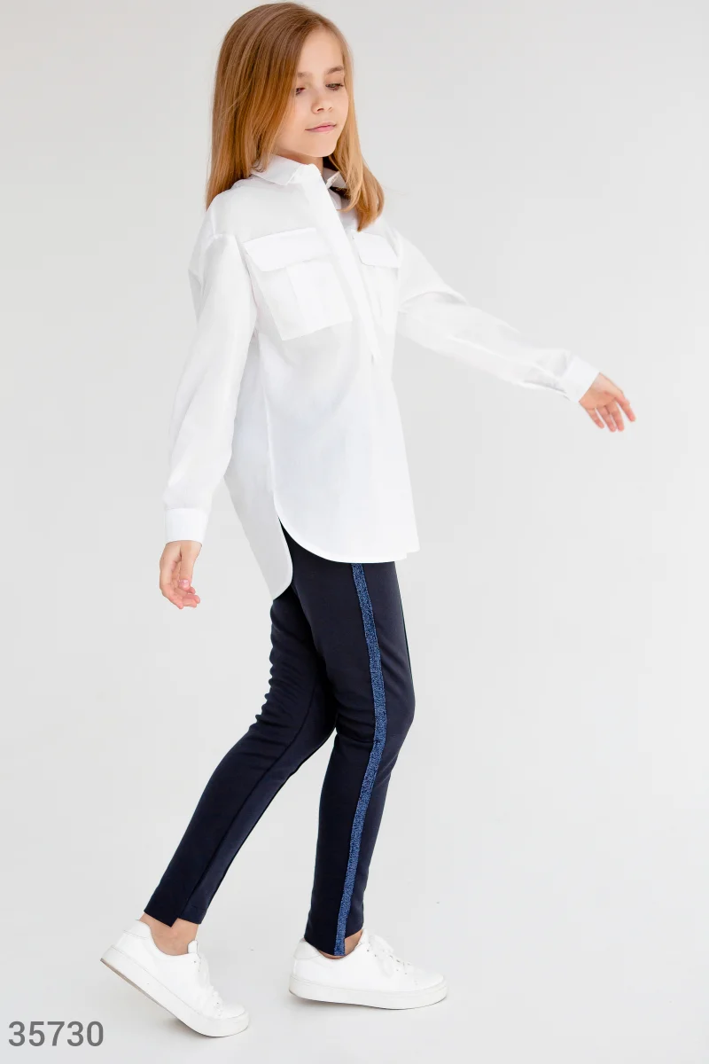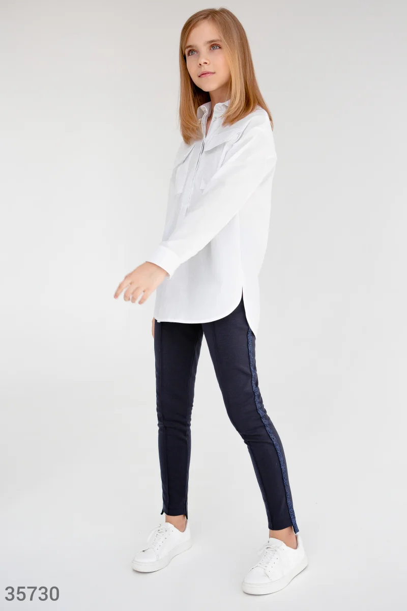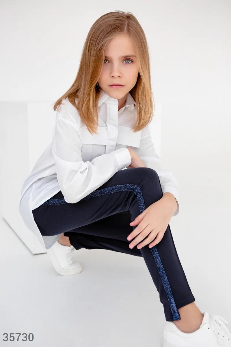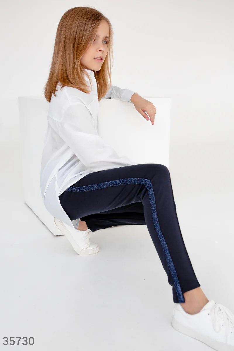 Зауженные синие брюки с яркими лампасами из мерцающей ткани. Высокая талия с эластичным поясом и удлиненные сзади нижние кромки – тренд 2020 года.