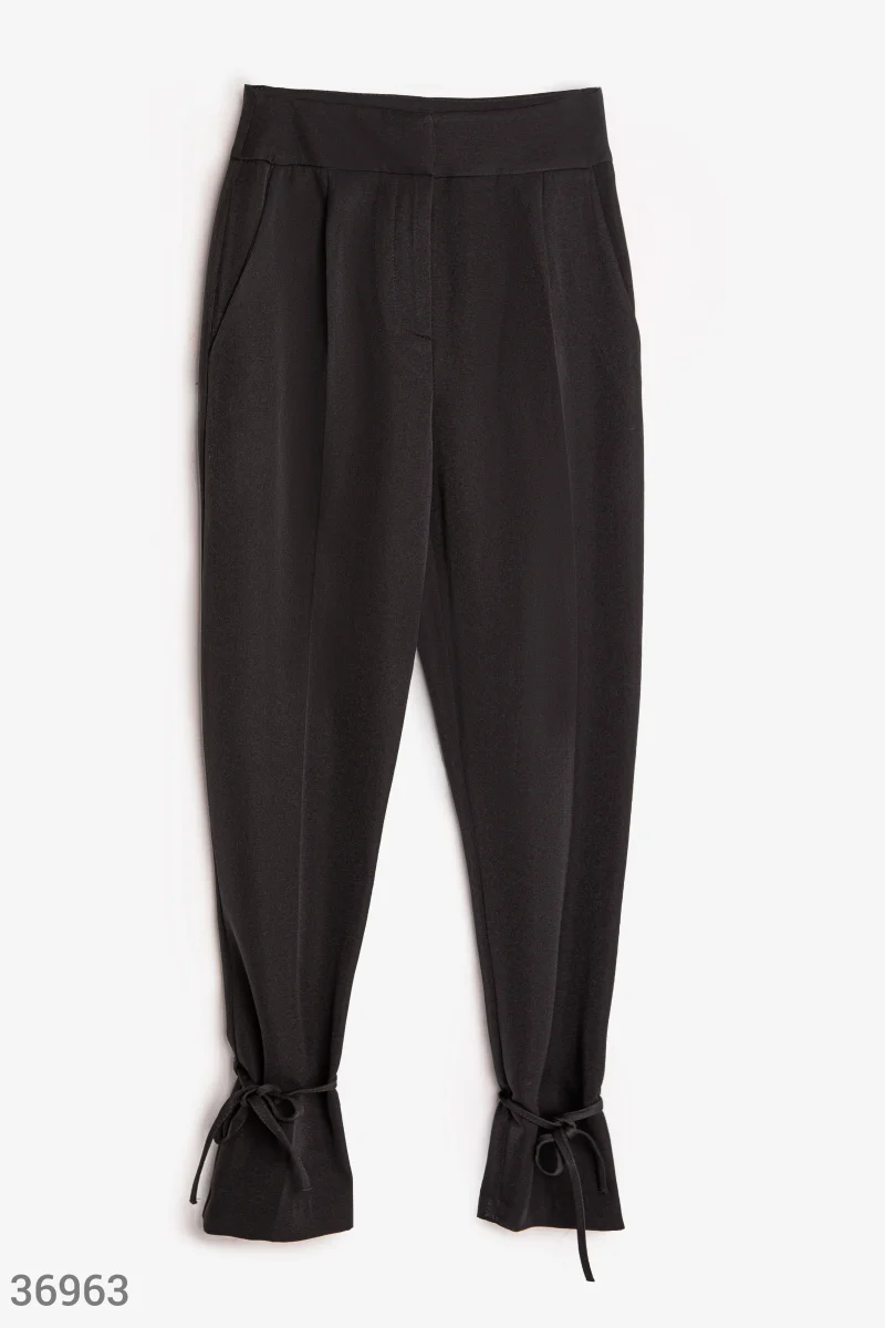 Черные укороченные брюки сшиты из гладкой костюмной ткани, которой синтетические волокна придают прочность и легкий блеск. Изделие с высокой посадкой на талии и защипами дополнили стрелками, которые визуально выстраивают вертикаль и придают образу графичность. Нижняя кромка брючин сбоку украшена декоративными бантиками.