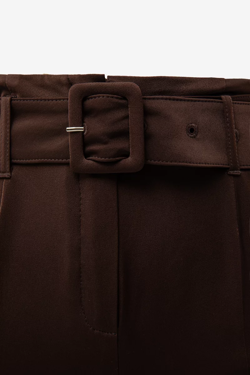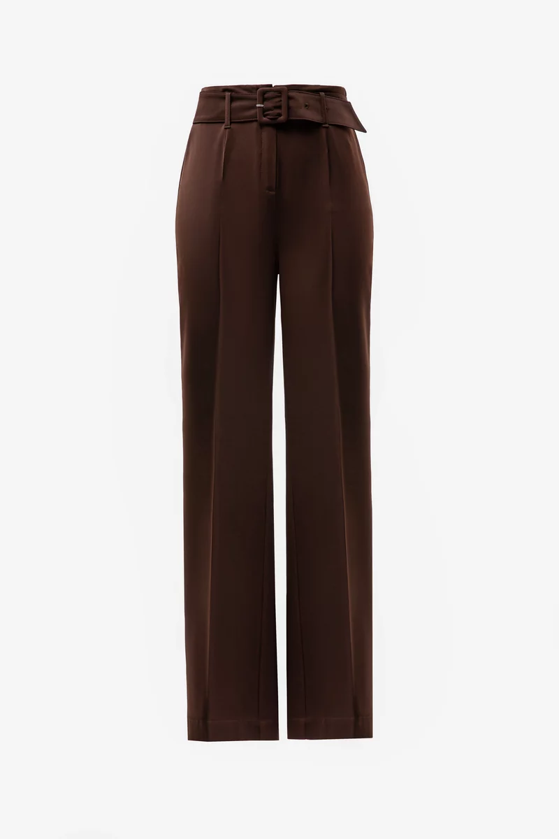 Брюки прямого кроя выполнены из приятного к телу сатина с гладкой фактурой. За счет высокой талии модель зрительно удлиняет ноги. Застегиваются на скрытую молнию спереди. Съемный пояс в комплекте