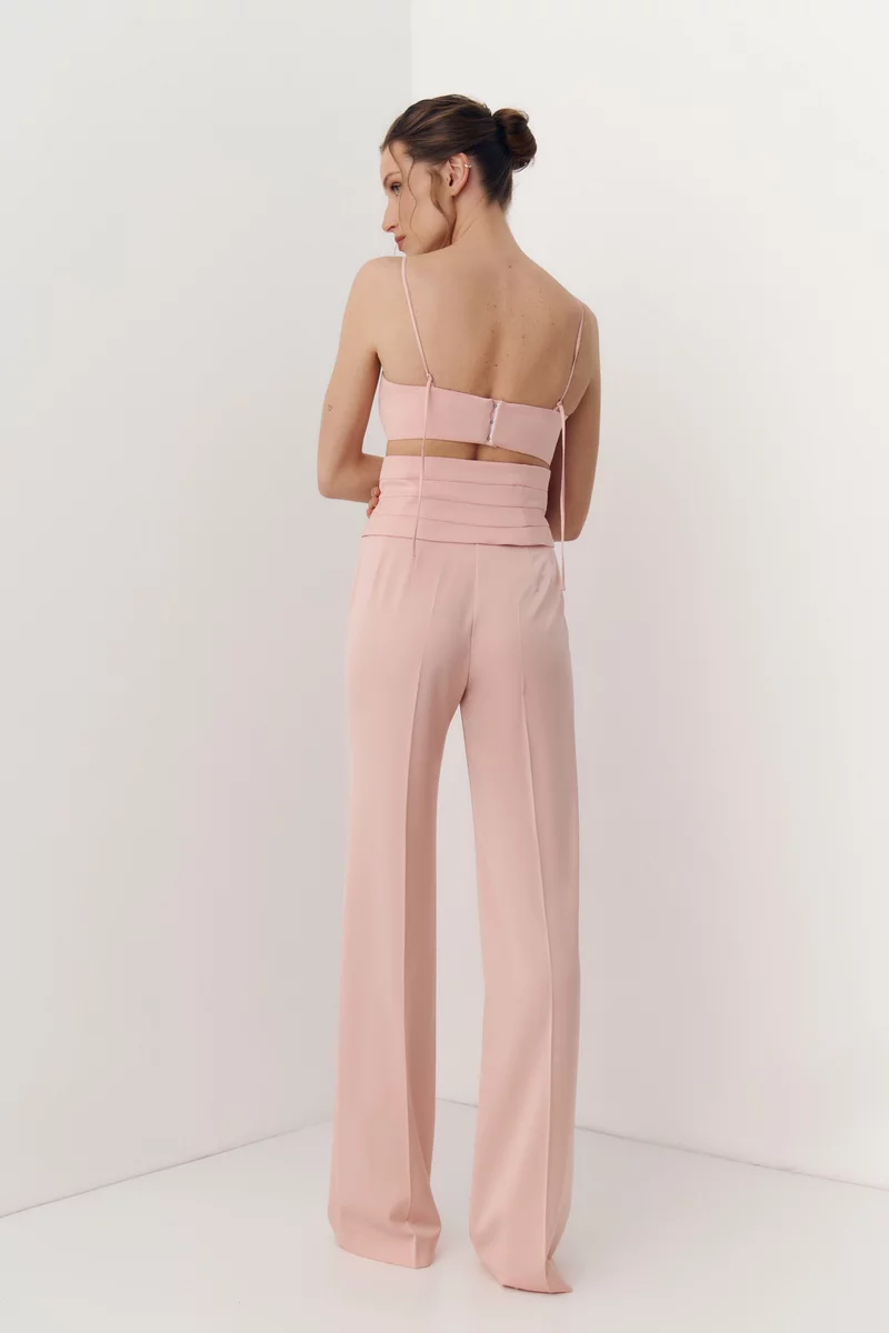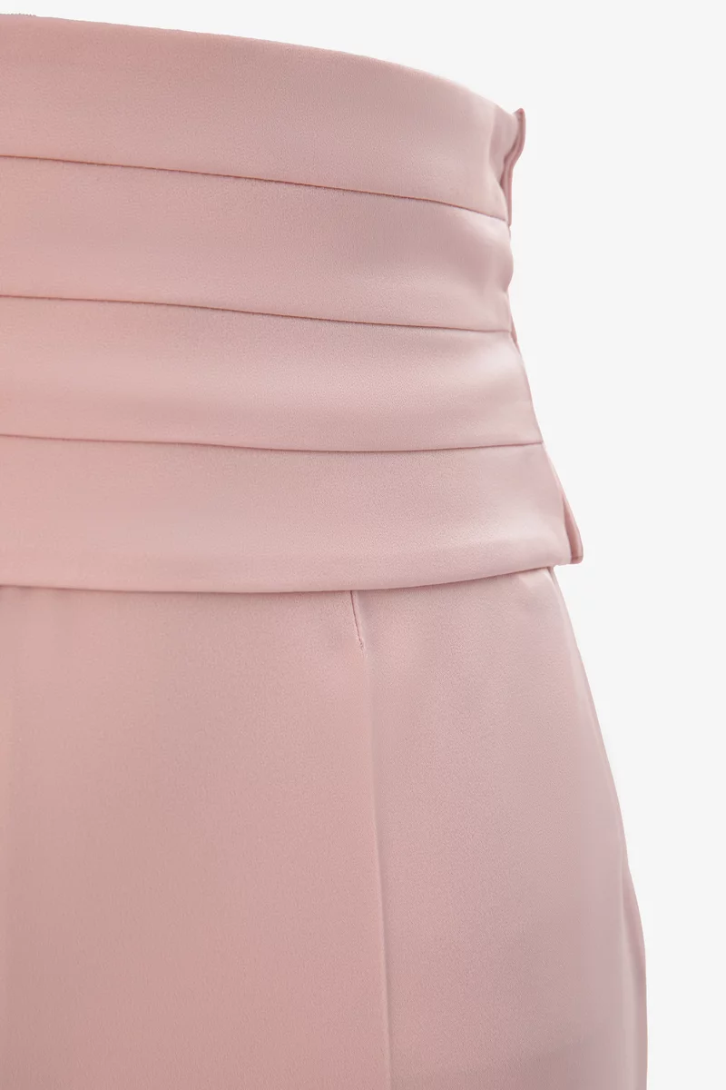 Брюки прямого кроя из приятного к телу сатина с гладкой фактурой. За счет высокой талии модель зрительно удлиняет ноги. Застегиваются на тайную змейку сбоку