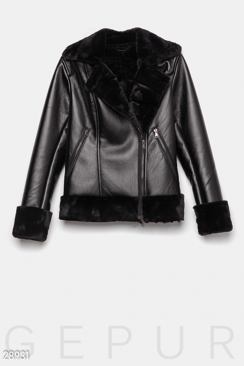 Трендовая женская куртка-авиатор с меховой отделкой, выполненная из эко-кожи premium класса: классический воротник с лацканами, длинный рукав с широкой манжетой и два вместительных кармана на молнии.