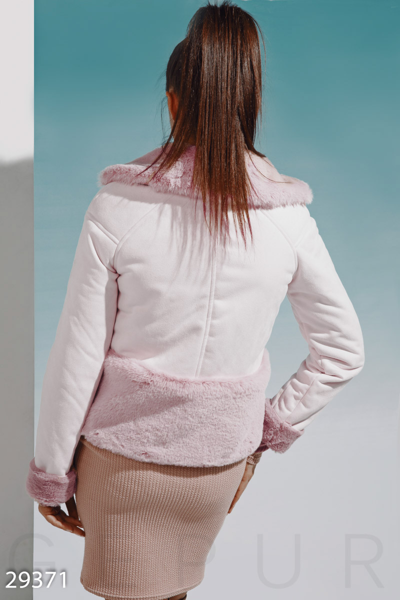 Легкая дубленка в стиле aviator, выполненная из мягкой эко-кожи premium класса: меховой воротник с застежкой, длинный рукав с необработанными краями и асимметричная застежка на молнию.