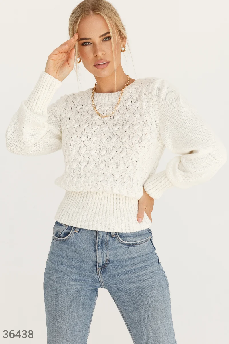 Приталенный джемпер базового белого цвета. Передняя сторона украшена ажурным плетением. Благодаря материалу, в таком изделии будет комфортно и в помещении, и на улице. Длинный рукав и нижняя кромка дополнены широкими эластичными планками. Модель возьмет на себя всю нагрузку в образе с лаконичными джинсами и кроссовками.