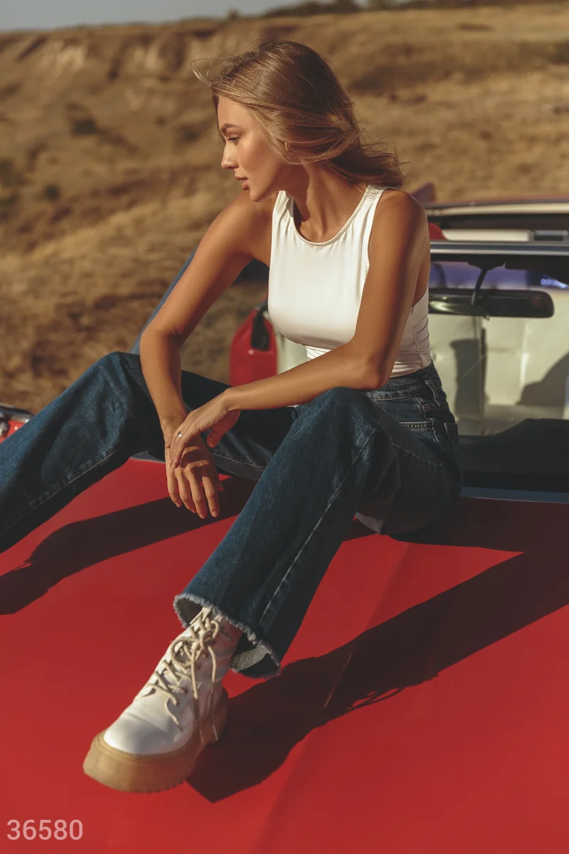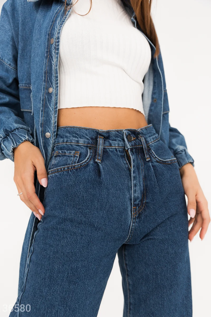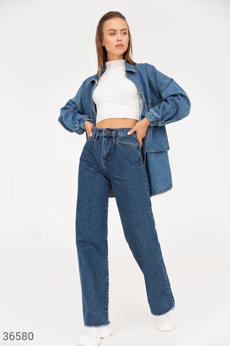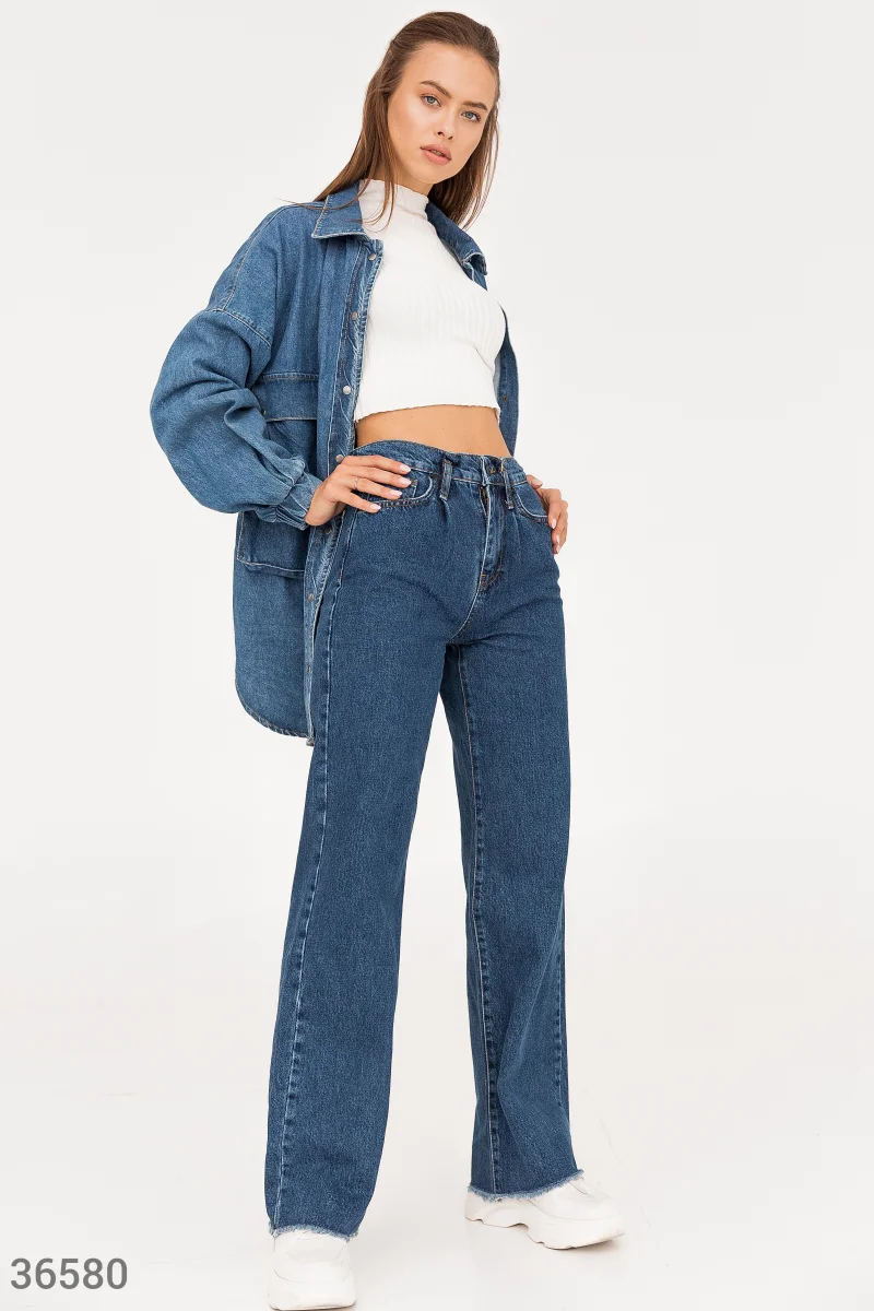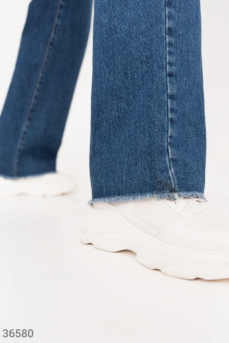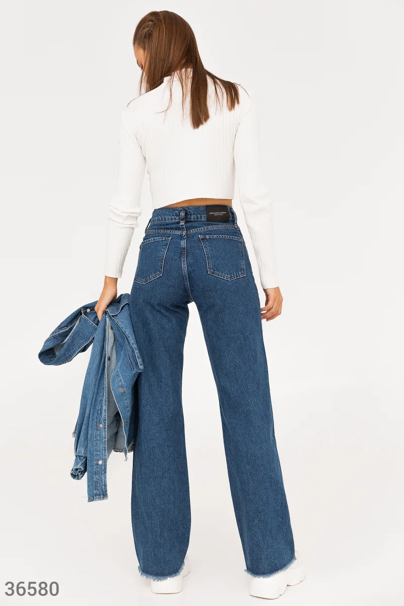 Синие широкие джинсы с высокой посадкой на талии создают отчетливый ретро-силуэт. Необработанный край брючин вносит легкую небрежность в образ. Модель дополнена накладными карманами на тыльной стороне.
