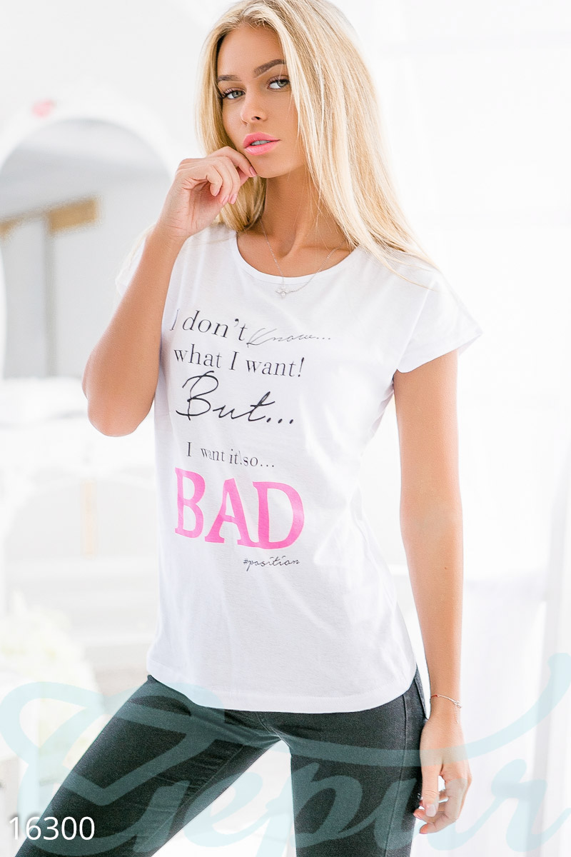 Футболки давно перекочевали из мужского гардероба в женский – и это естественно. Чувство комфорта, которое дарят футболки в качестве повседневной одежды – не знает аналогов и поэтому было оценено по праву. Уникальности данной модели придаёт стильный принт спереди – игра шрифтов дополняется строгостью букв, а смысл надписи заставляет улыбнуться. Футболка станет чудесным выбором для ежедневных прогулок, дружеских встреч и даже для игры в футбол.