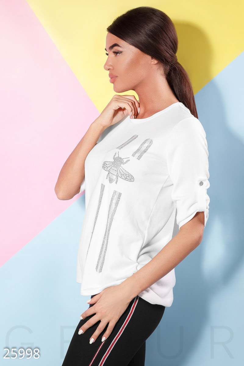 Футболка классная, не разочаровала! Трикотаж плотный, для прохладной погоды, приятный на ощупь; красивая и благородная аппликация из крохотных переливающихся черных и "алмазных" камушков. Моего размера (М-Л) не было, но очень довольна, что взяла XL...Детальнее