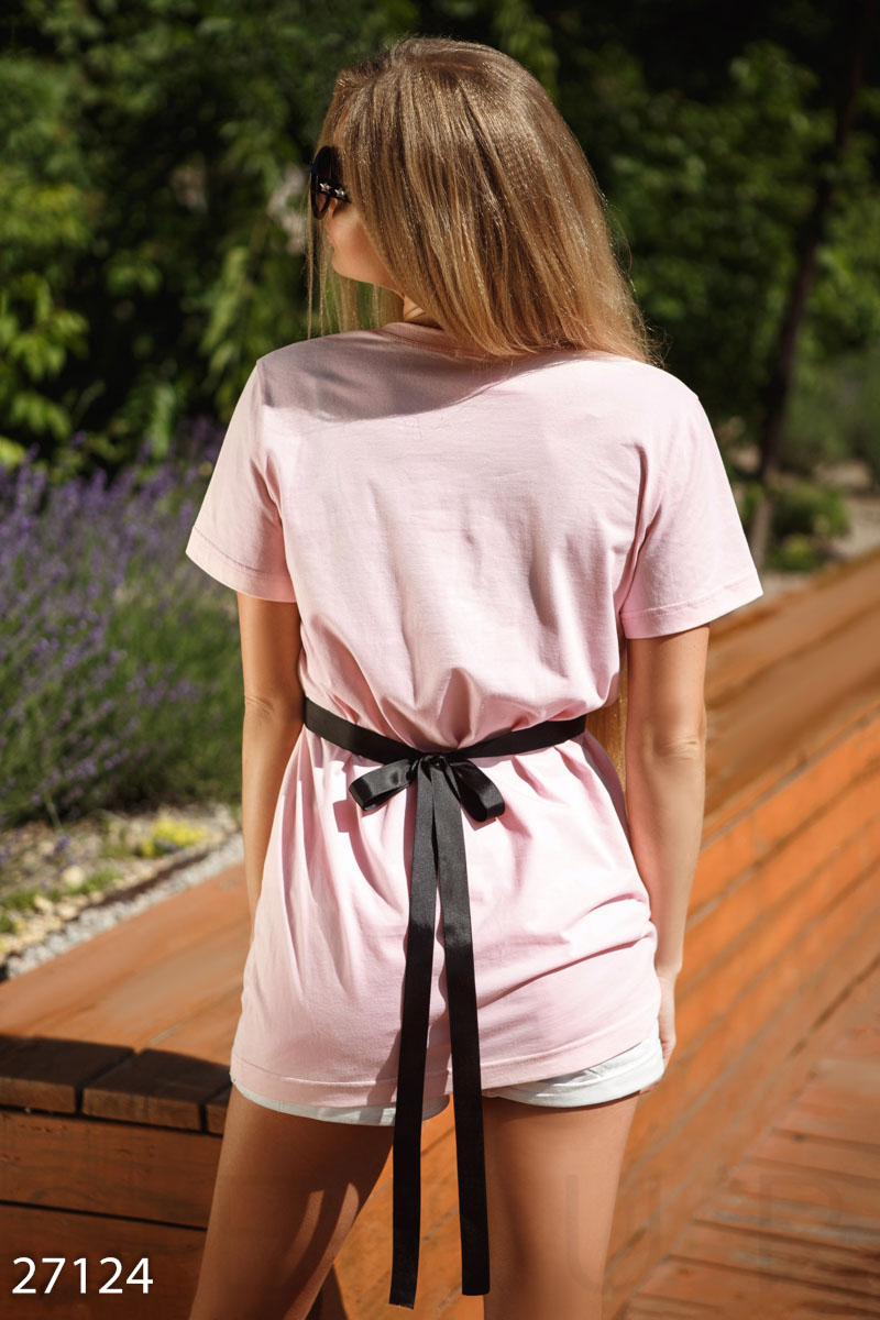 Удлиненная хлопковая футболка с тематическим накатом "корсет" и двумя завязками из репсовой ленты.