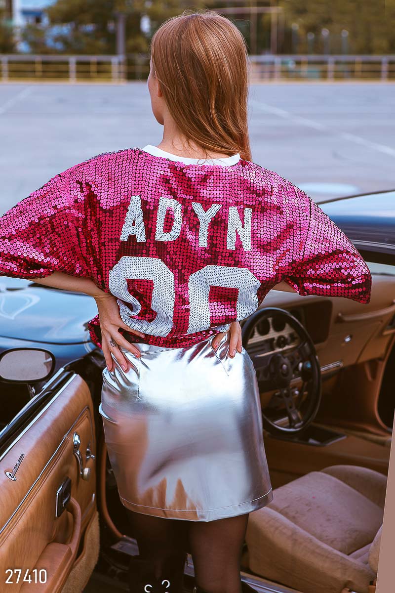 Аутентичная футболка, расшитая пайетками: свободный крой, широкий рукав, цветная эмблема "lips" спереди и контрастная надпись сзади.