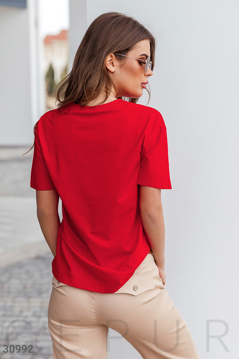 Стильная повседневная футболка с классическим круглым вырезом, коротким рукавом и контрастным накатом-надписью спереди.