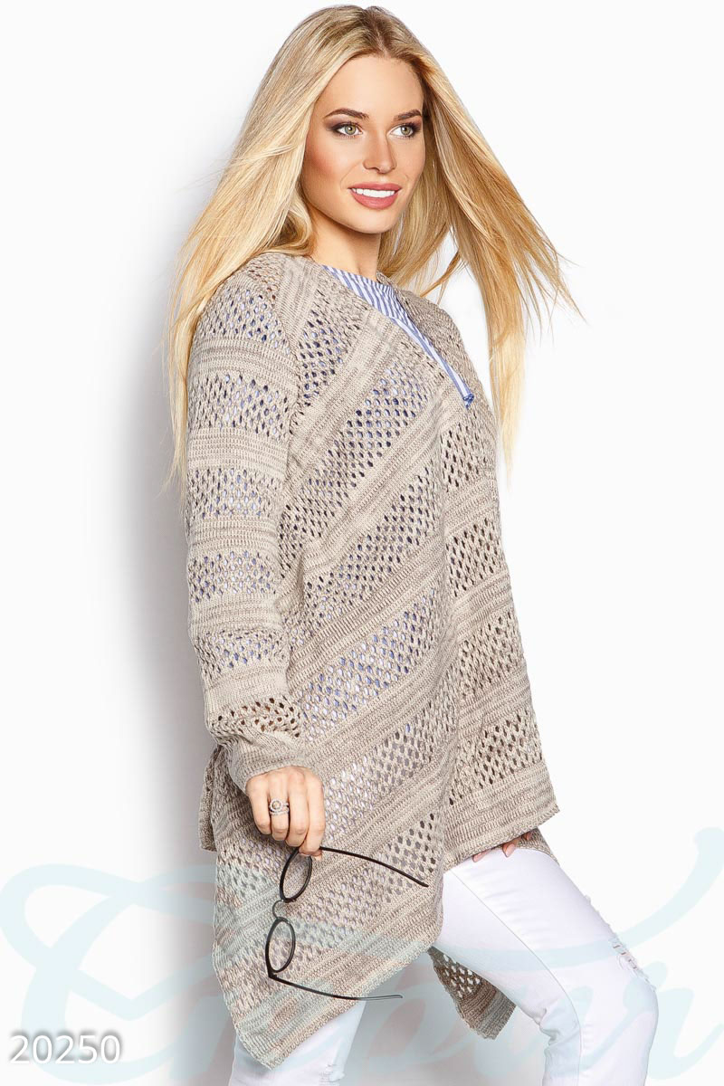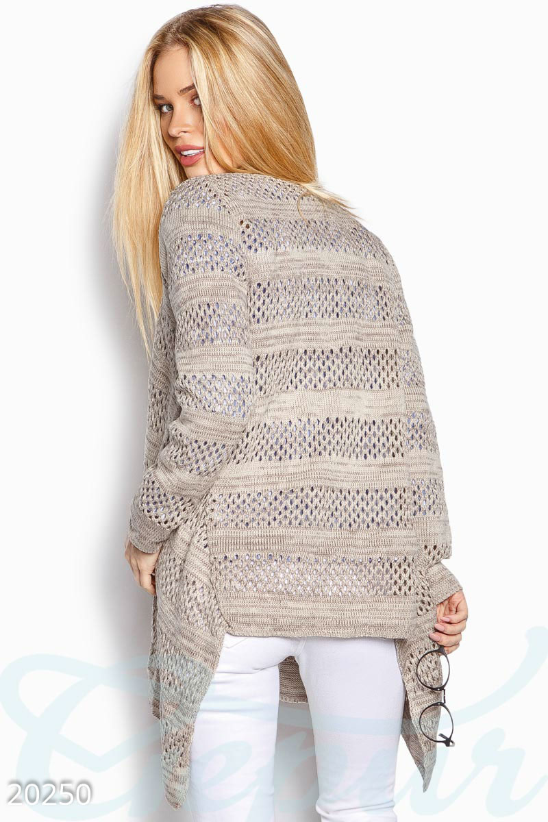 Кардиган свободного кроя с красивым ажурным узором. брала Размер универсальны. На мой 42 размер сел хорошо, хоть и свободновато, но такая модель. покупкой довольна. Доставка не подвела, дошло до России за недели 2.