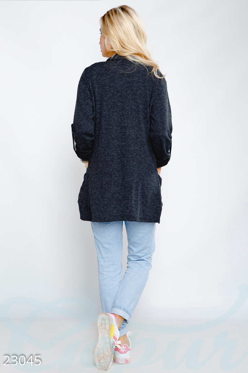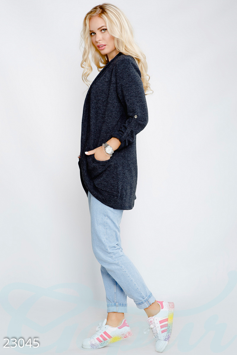 Асимметричный кардиган из мягкого трикотажного полотна: длинный рукав с регулятором длины (застежки-паты), закругленные полы и два накладных кармана по бокам.