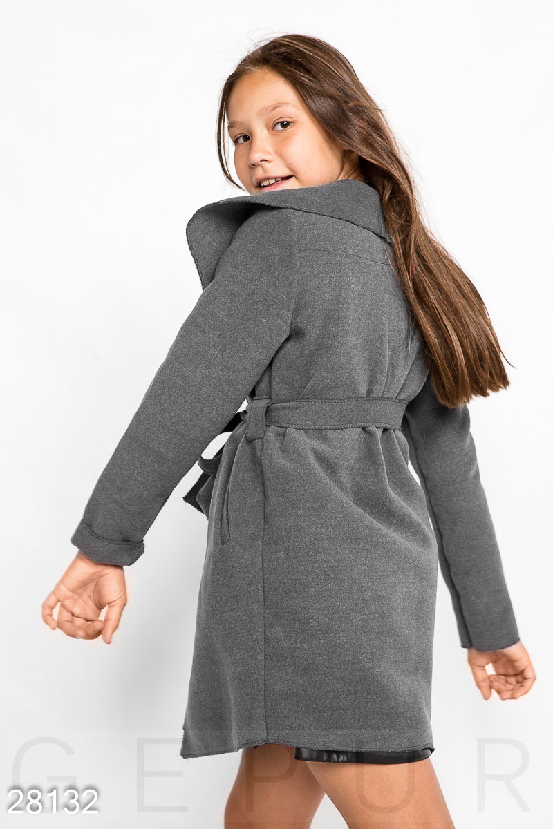 Демисезонный детский кардиган из эко-кашемира с большими лацканами, двумя карманами и съемным поясом на петлях.