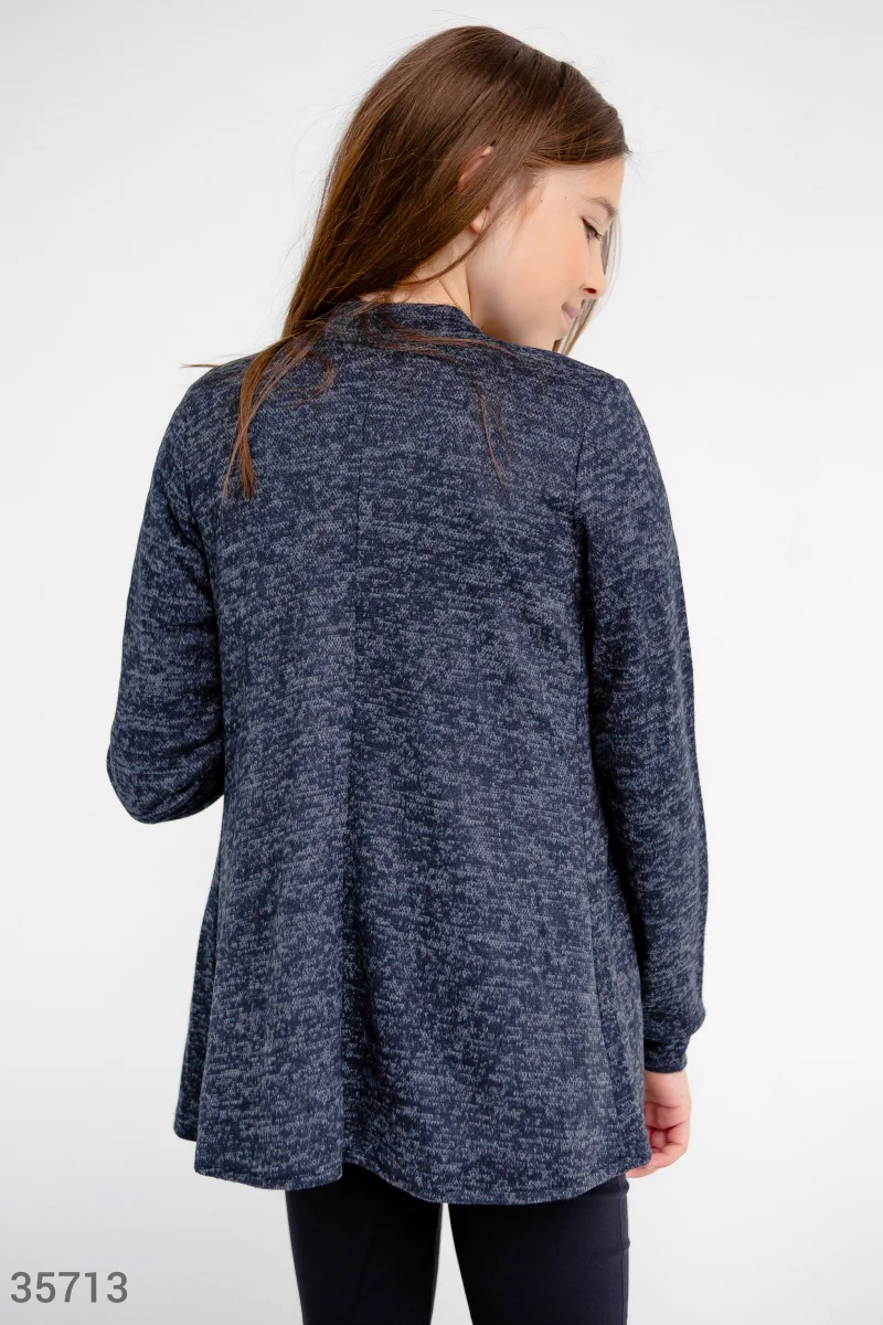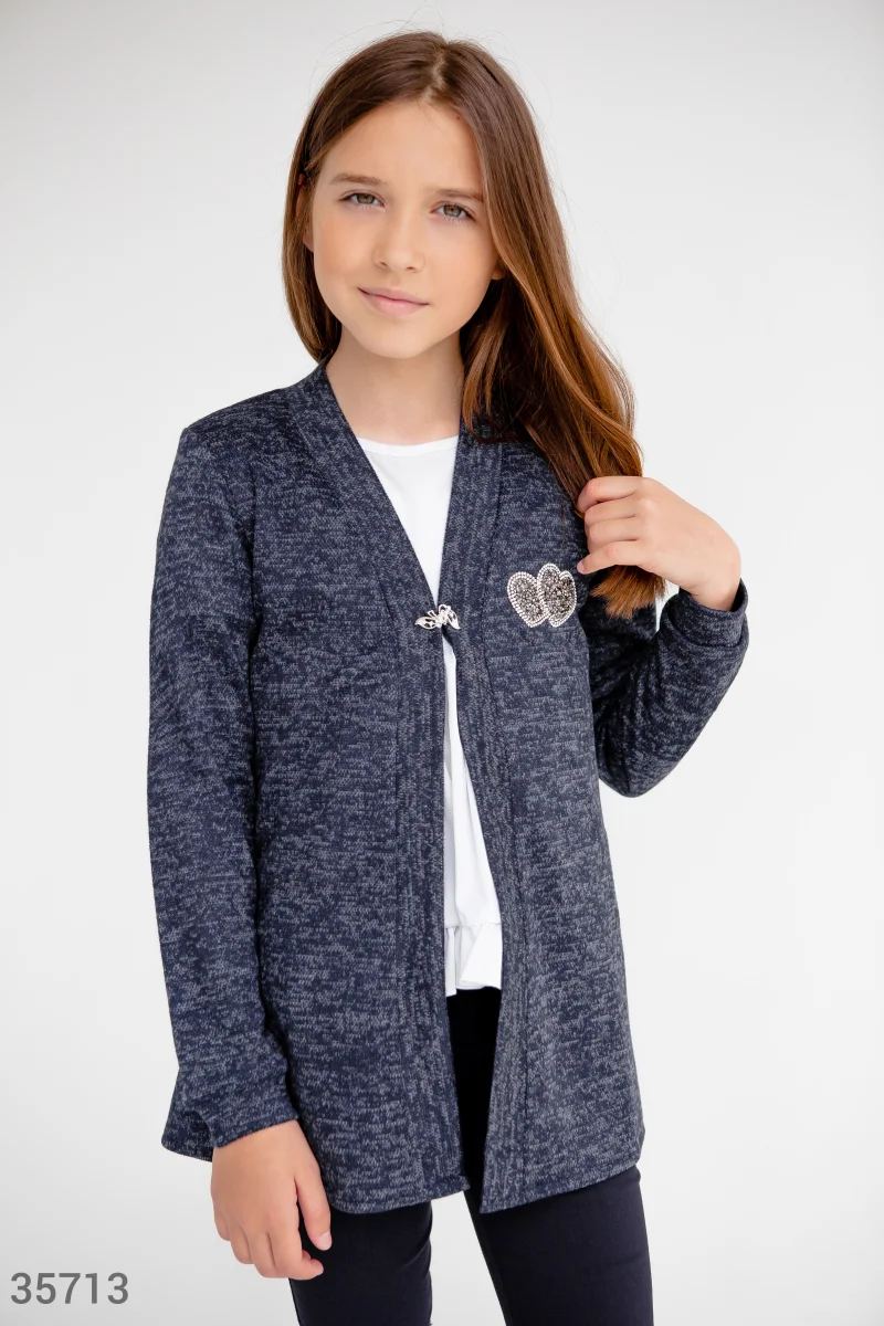 Комфортный кардиган из мягкой трикотажной ткани синего цвета. Застежка-крючок является дополнительным аксессуаром, украшающим простую лаконичную модель.