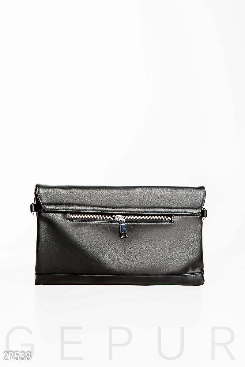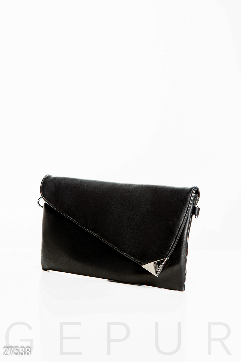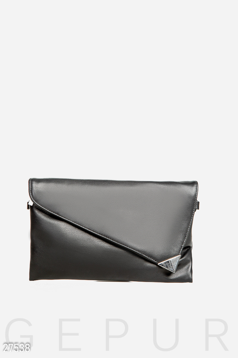 Стильный женский клатч, выполненный из мягкой эко-кожи: асимметричный клапан с металлическим декором, карман на молнии и съемный плечевой ремешок с регулятором длины.