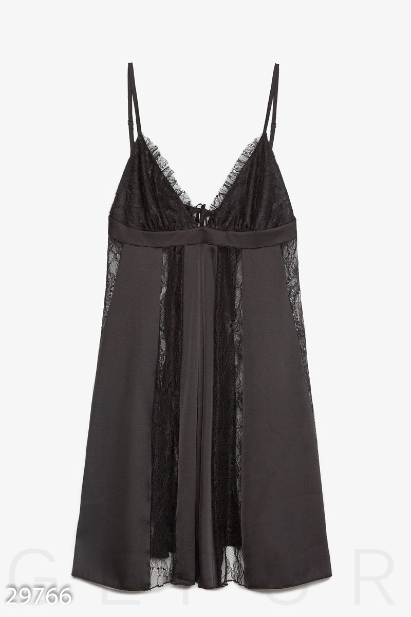 Женская шелковая комбинация с прозрачными кружевными вставками от дизайнеров Gepur: тонкие регулируемые бретели, завышенная линия талии и небольшой v-образный вырез сзади на атласных завязках.
