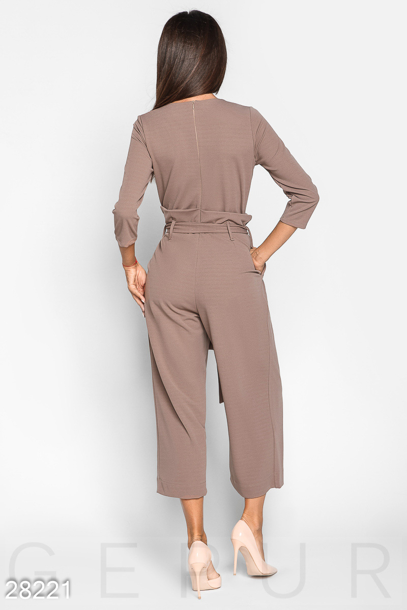 Однотонный комбинезон, выполненный из мягкого итальянского крепа: лаконичный лиф, облегающий рукав 3/4, отрезная талия с защипами и брюки-кюлоты с двумя карманами по бокам и съемным поясом в петлях.