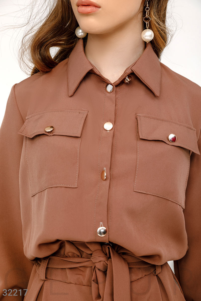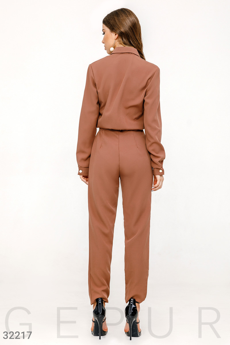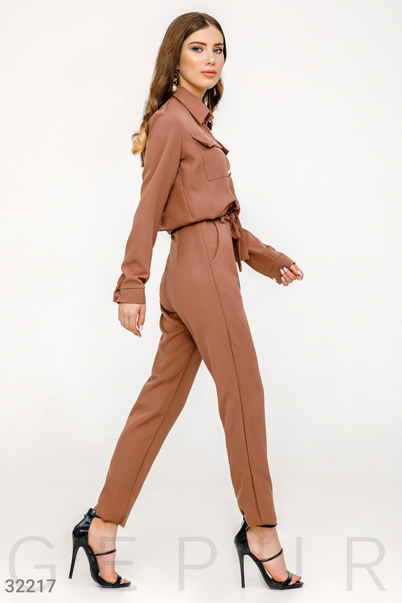 Классический брючный комбинезон базового бежевого цвета: отложной воротник, длинный рукав на широкой манжете, два накладных кармана с клапаном на груди, эластичная вставка на талии, съемный однотонный пояс, брюки прямого кроя с двумя прорезными карманами по бокам.