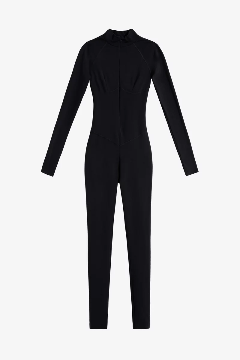 Комбинезон из мягкого трикотажа на тонком и плотном футере – ткань отлично сохраняет тепло, при этом эффектно подчеркивает фигуру и моделирует силуэт. Имеет воротник-стойку, застегивается на скрытую молнию спереди. Есть вырез на палец
