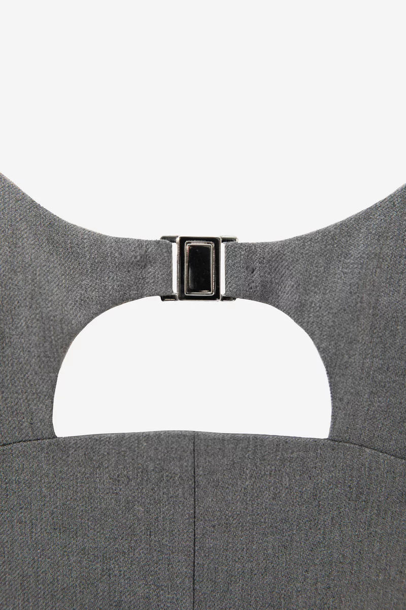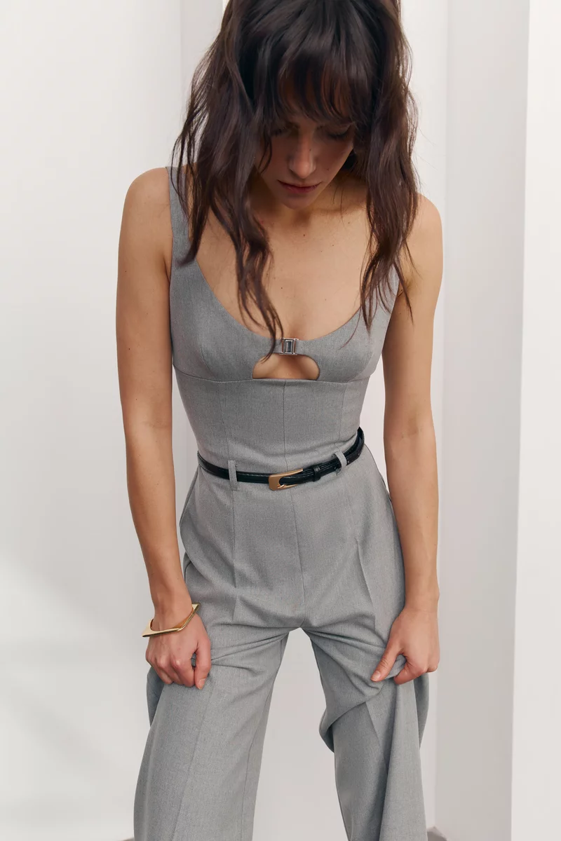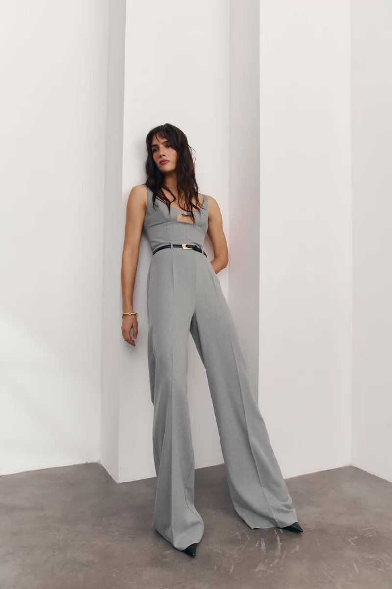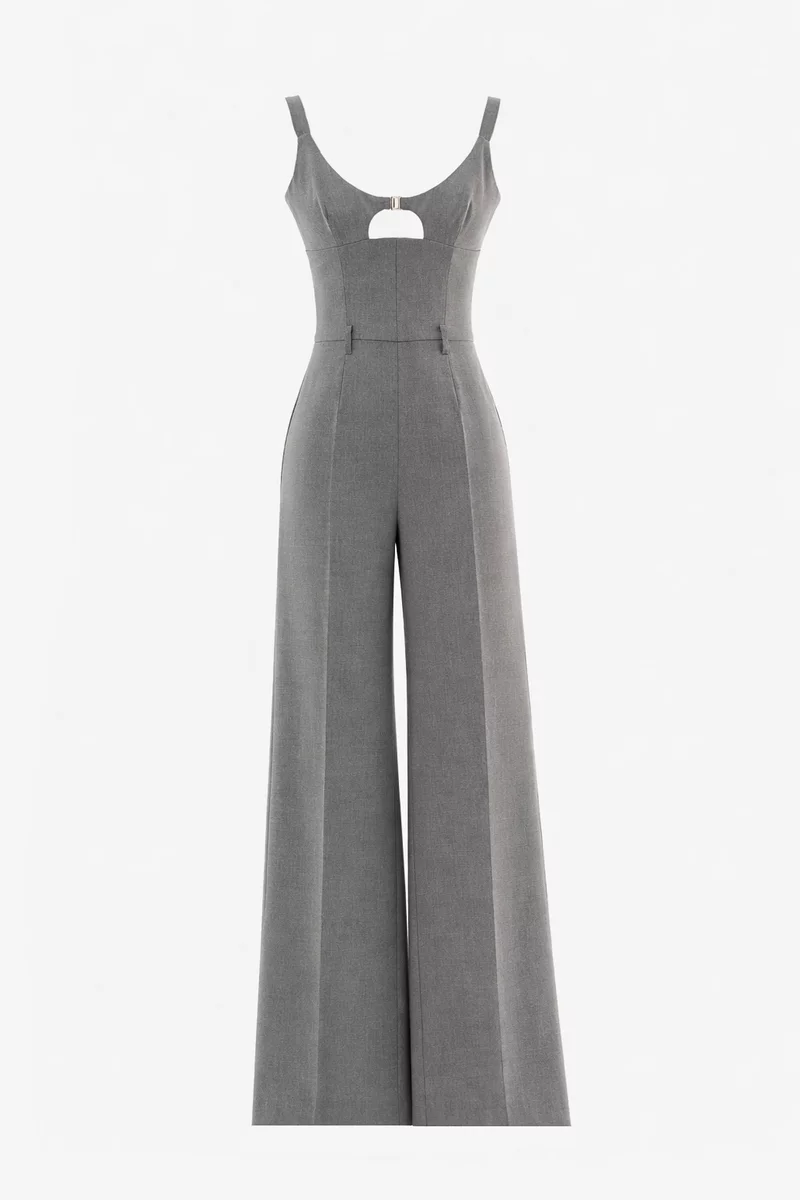 Комбинезон из костюмной ткани на бретелях. Модель идеально подчеркивает силуэт. Застёгивается на скрытую молнию сзади. Брюки-палаццо свободного прямого кроя