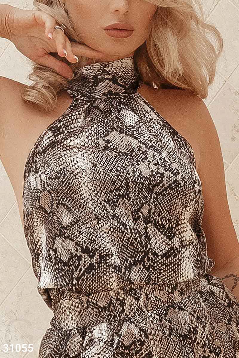 Стильный женский комплект в трендовый змеиный принт, выполненный из мягкой шелковой ткани, от дизайнеров Gepur: топ свободного кроя без рукавов с воротником-халтер на завязках, открытой спинкой и небольшими боковыми разрезами, шорты с высокой посадкой, эластичной вставкой на поясе и двумя карманами в швах.