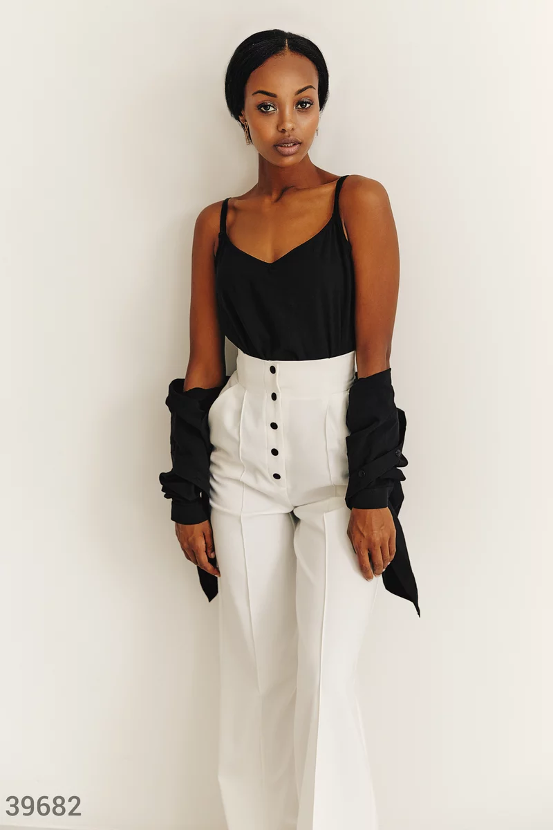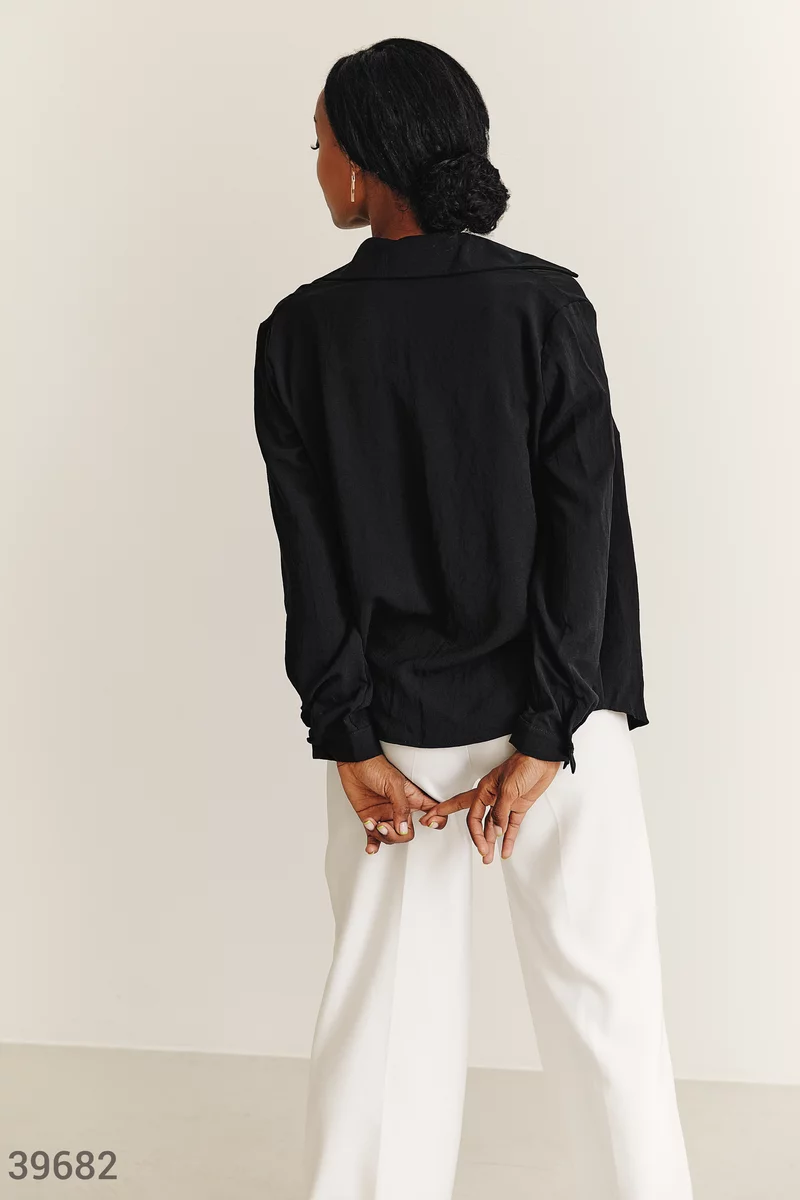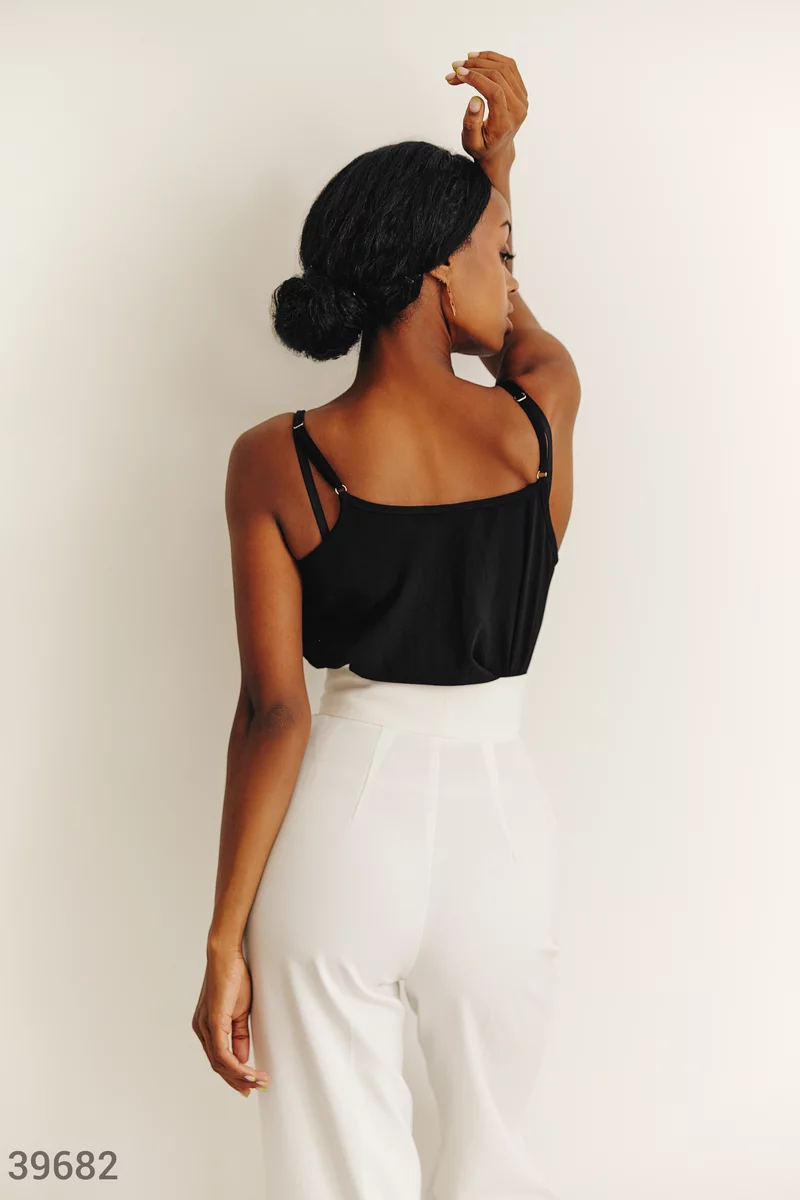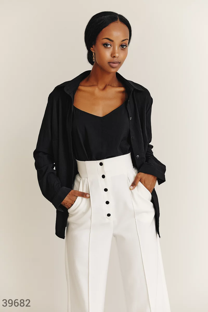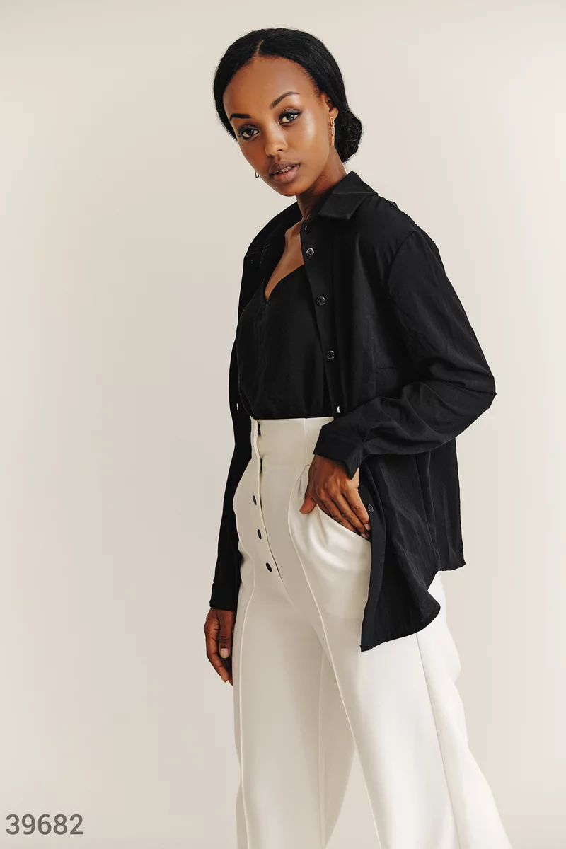Комплект из топа и рубашки черного цвета. Рубашка на пуговицах с длинным рукавом, тонкими манжетами, с отложным воротником. Топ прямого кроя на тонких регулируемых бретелях, с открытой спиной. Благодаря универсальности вещей из можно носить как вместе, так и по отдельности, что поможет создавать множество образов.