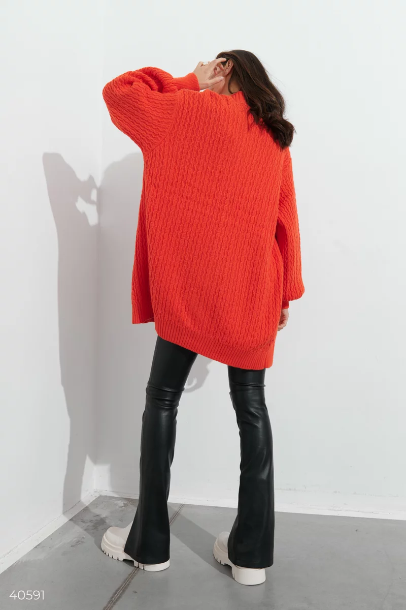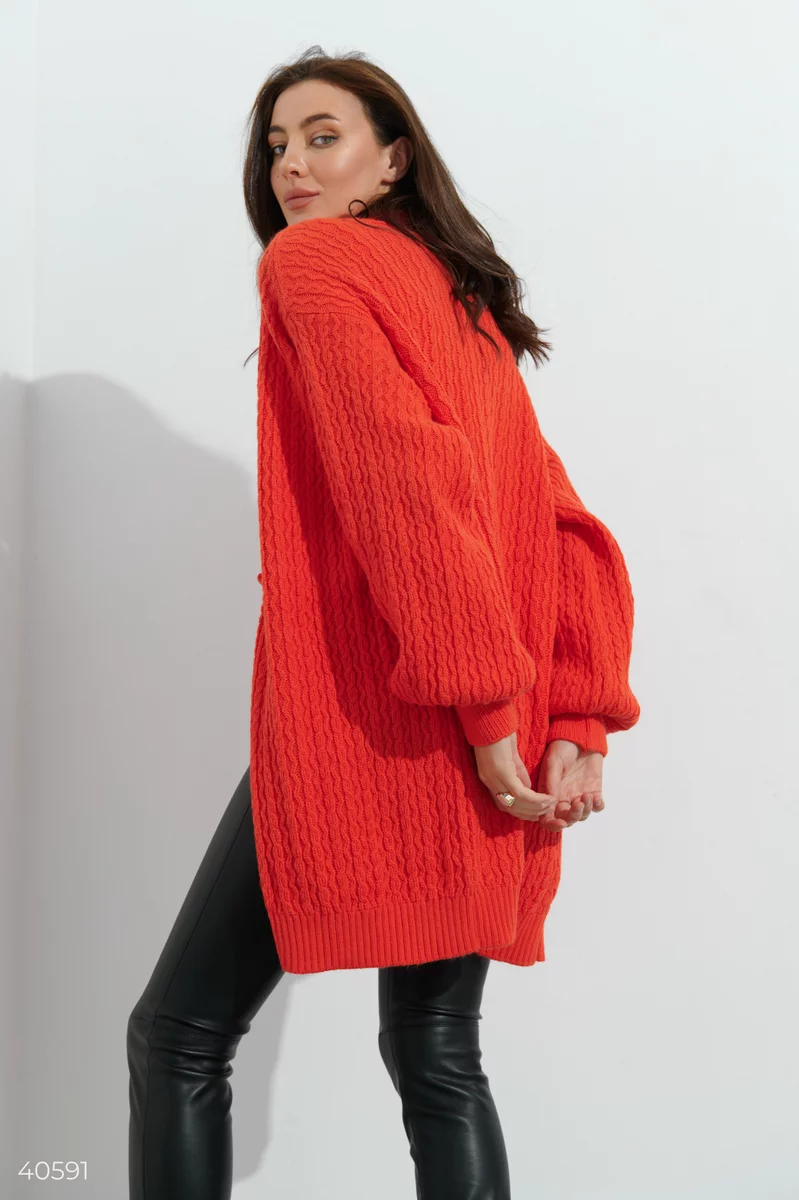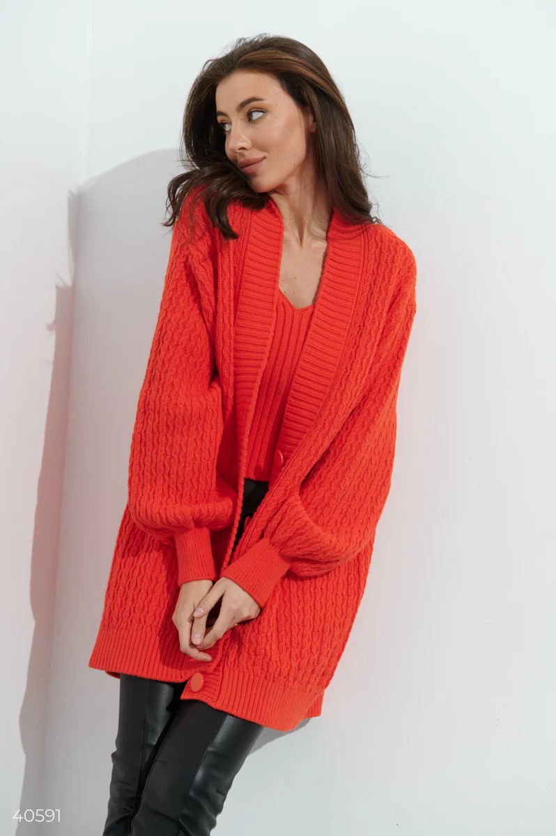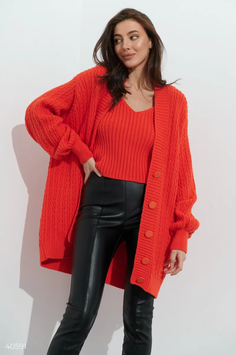 Яркий коралловый кардиган oversize выполнен из вязаного трикотажа, украшенного узором, в комплекте с топом. Модель представлена с глубоким v-образным вырезом, крупными пуговицами в тон и трендовым широким рукавом. В своих коллекциях такое направление поддержали Max Mara, Louis Vuitton и Altuzarra.