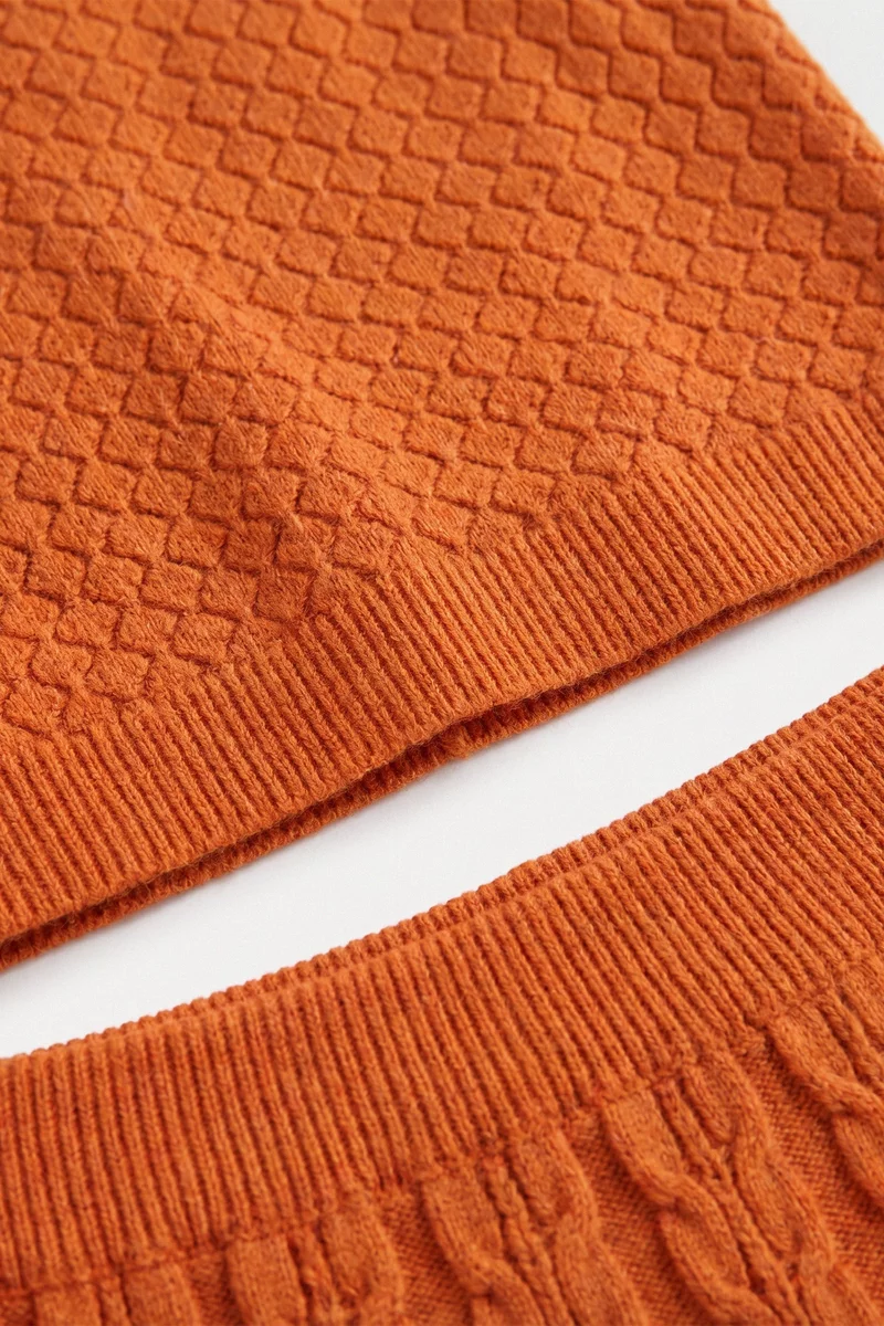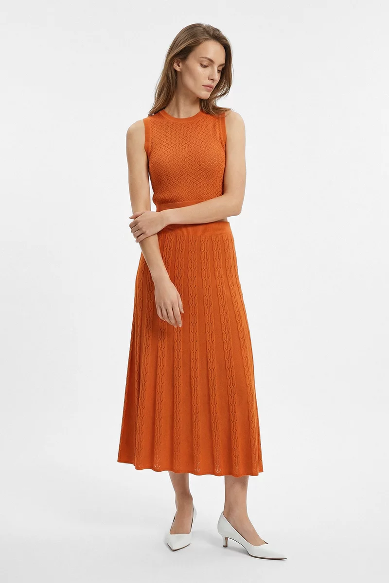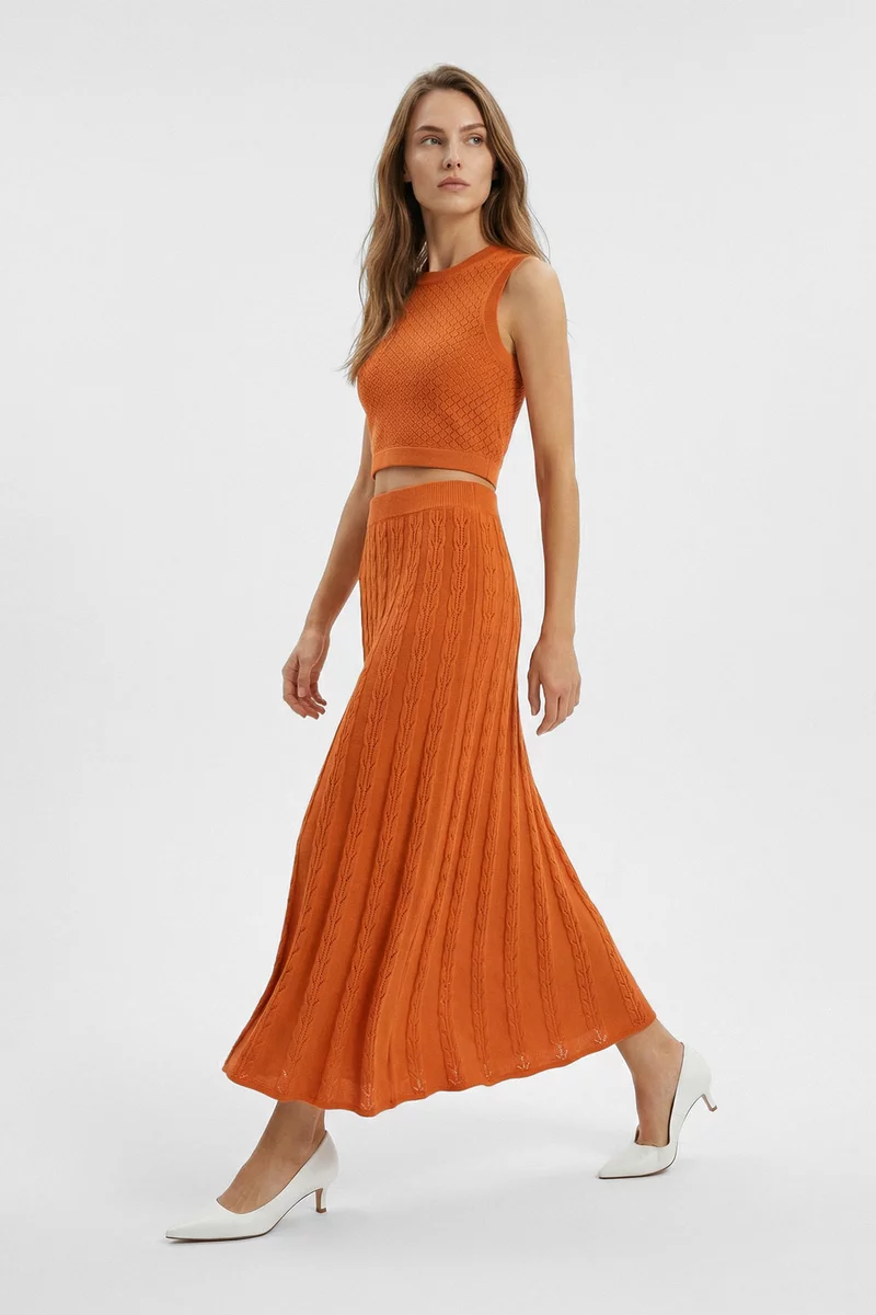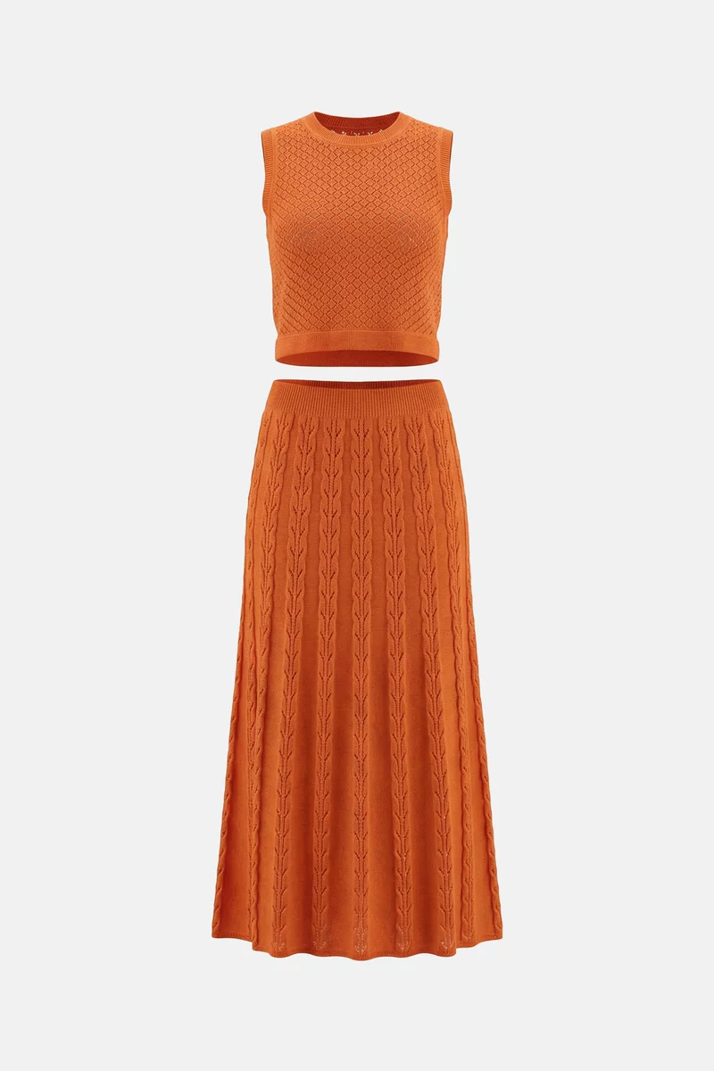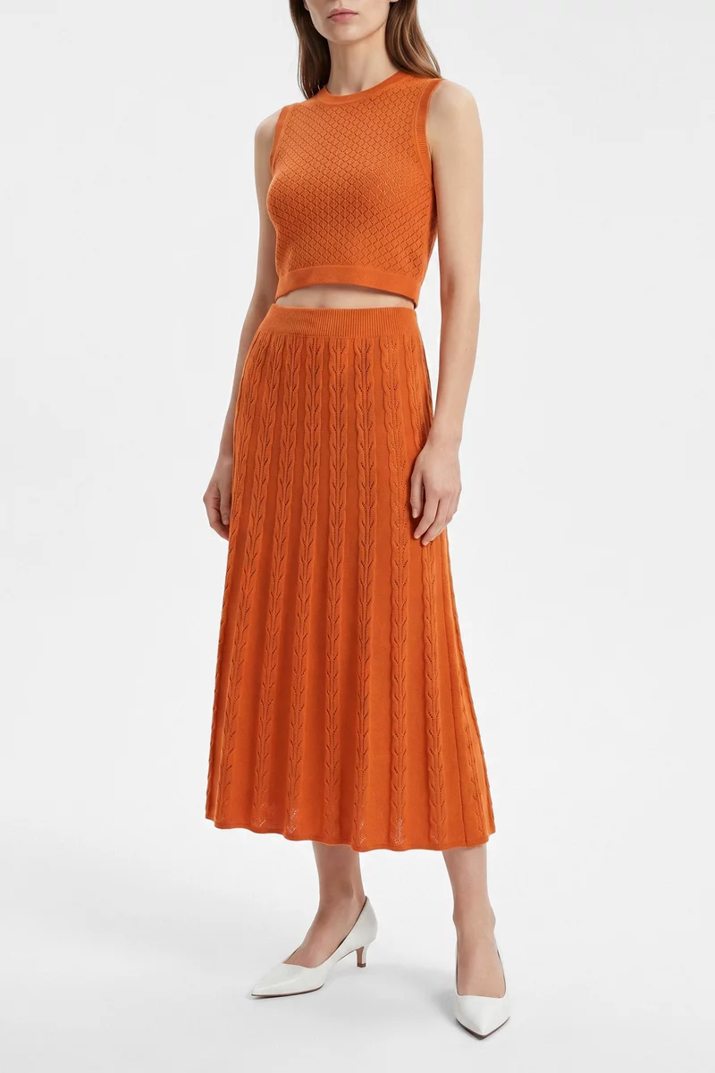 Оранжевый комплект из юбки и топа с ажурной вязкой