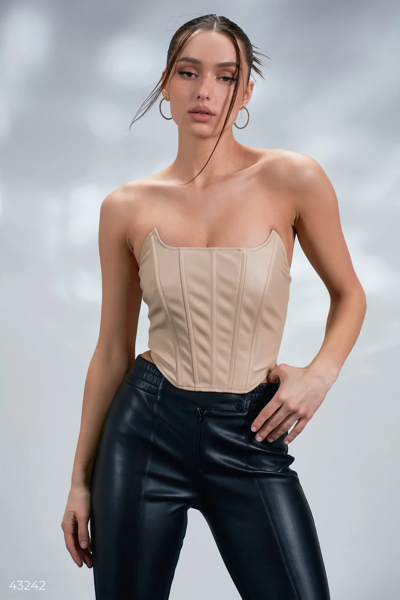 Для изготовления новой коллекции выбрали мягкую и плотную экокожу на замшевом подкладе. Корсет - ода женской красоте от всей нашей команды. Минималистичный и лаконичный крой дополняет гладкая и матовая кожа. Топ-корсет открывает зону декольте и ключицы, при этом подчеркивает талию. На шнуровке.