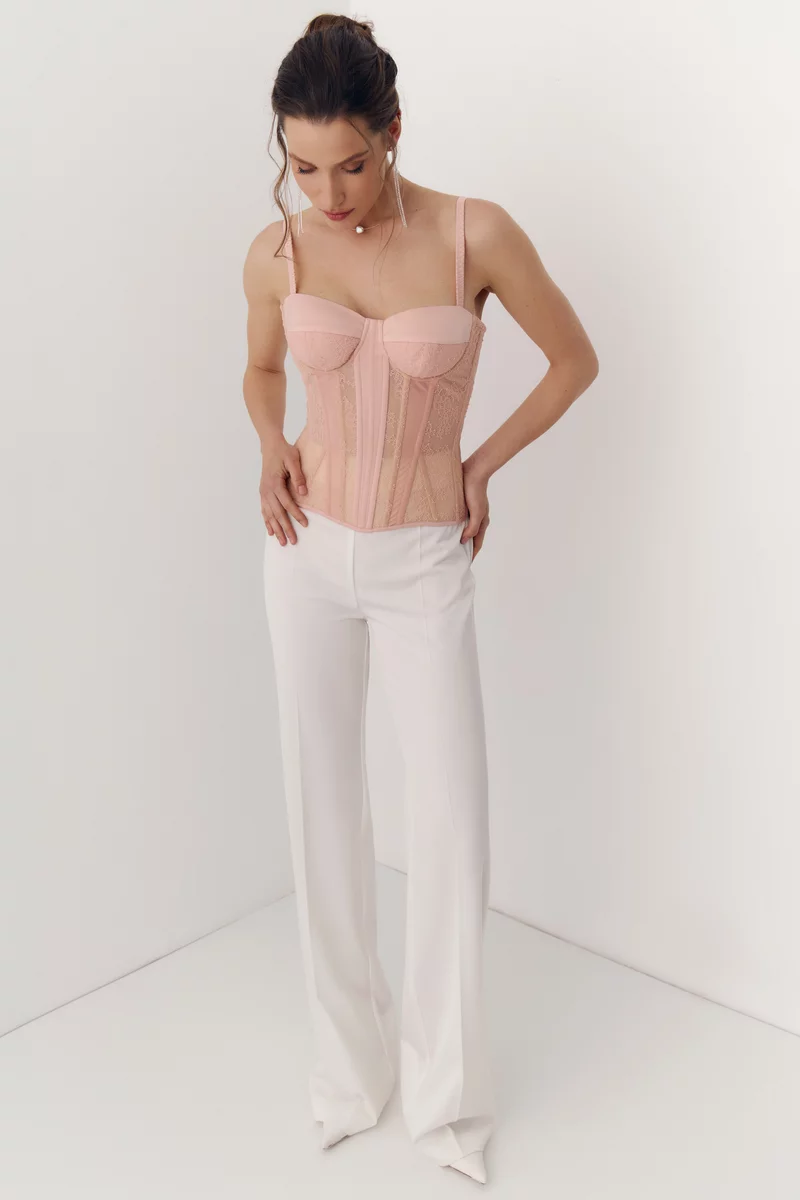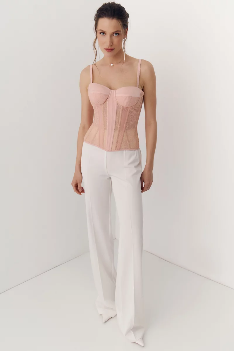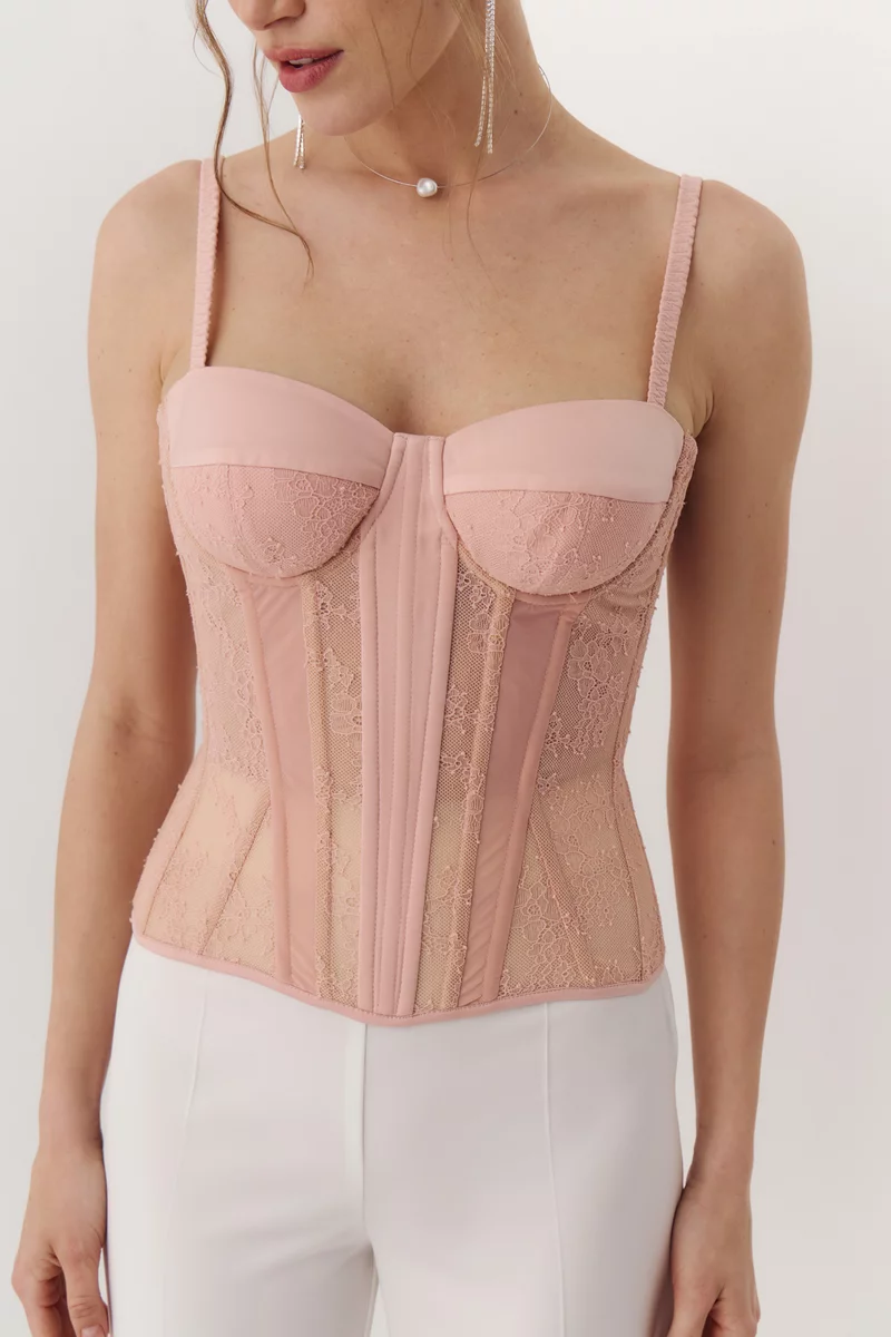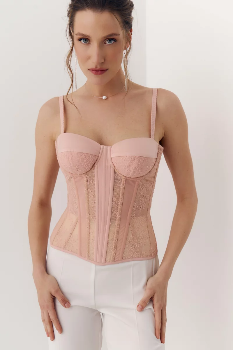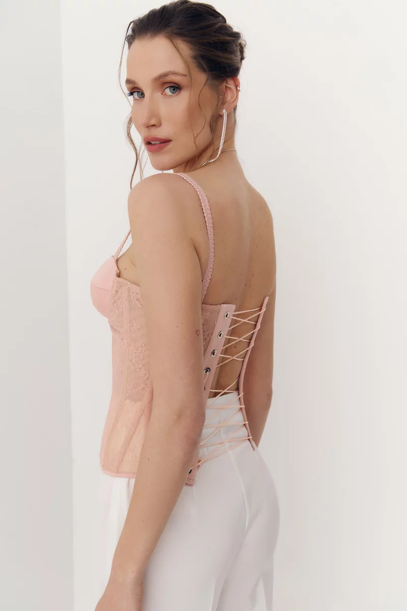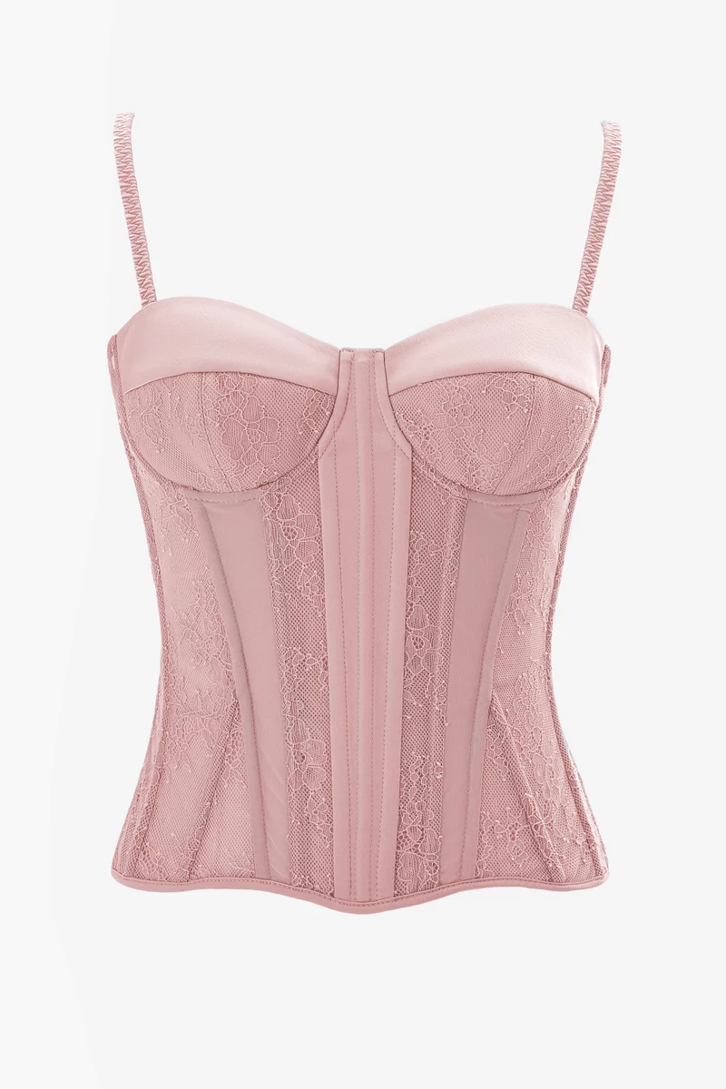 Сатиновый корсет на тонких бретелях. Акцентная деталь – моделирующие вставки. Спинка стилизована шнуровкой, позволяющей регулировать объем. Корсет на косточках, эффектно подчеркивающий силуэт. На подкладке