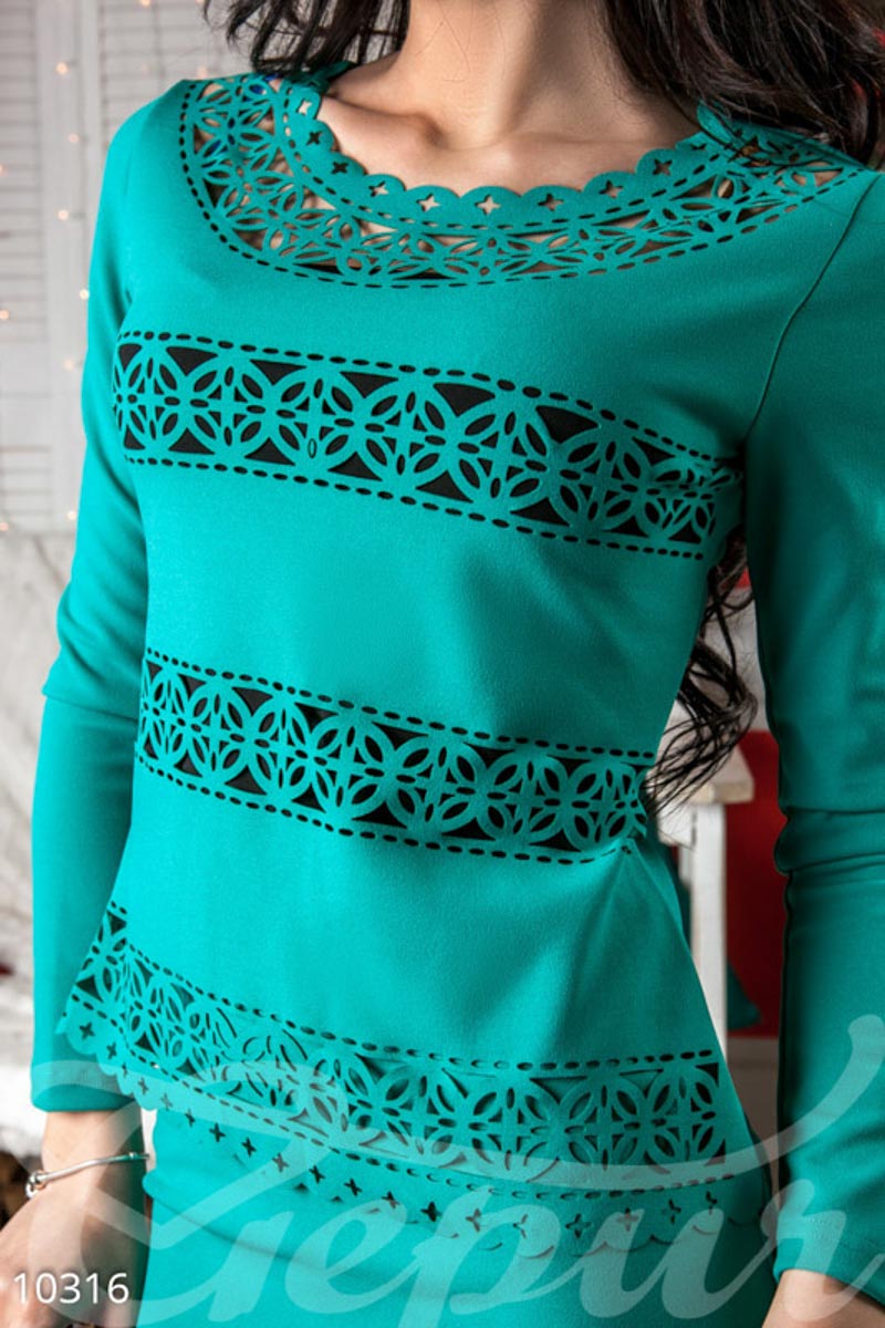 Оригинальный костюм из эластичной ткани, украшенной фигурной перфорацией: топ прямого кроя с круглым вырезом и длинным рукавом без манжет, облегающая юбка с высокой посадкой с небольшим разрезом.